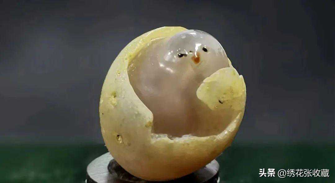 这件奇石浑然天成,细看之下仿佛蛋壳破裂,一只色泽淡黄的毛茸茸小鸡伸头欲出,石质滋润、神态逼真。