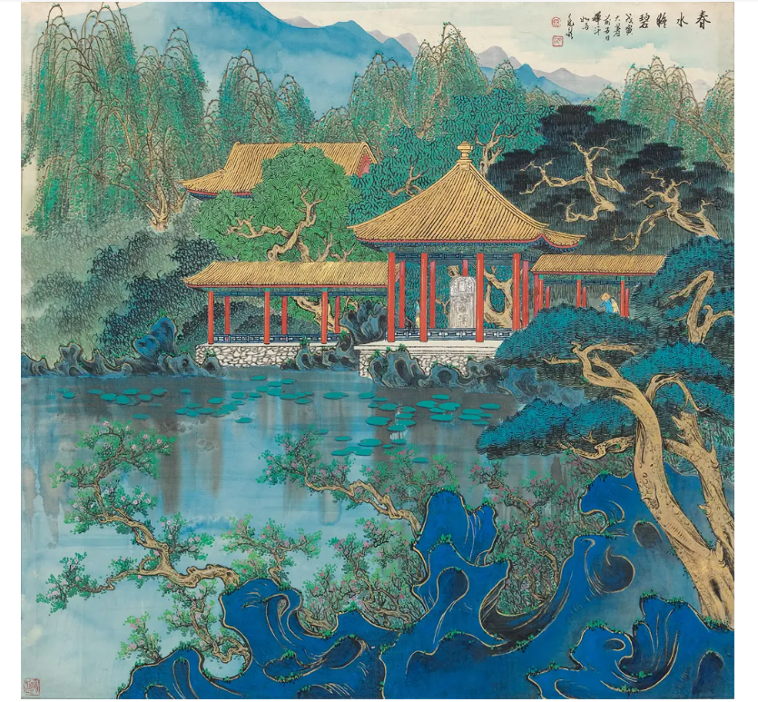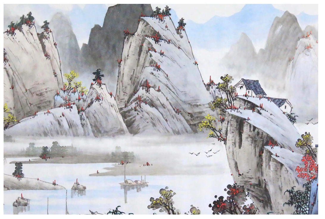 宋兆钦擅长青绿山水,画风在继承传统的基础上推陈出新,将工笔与写意相结合,艺术风韵独特,金碧为纹的山水画,设色富丽,极具装饰性。其红船井冈山系列作品则展现了他作为一个从小深受红色文化熏染的老一辈艺术家的坚守。