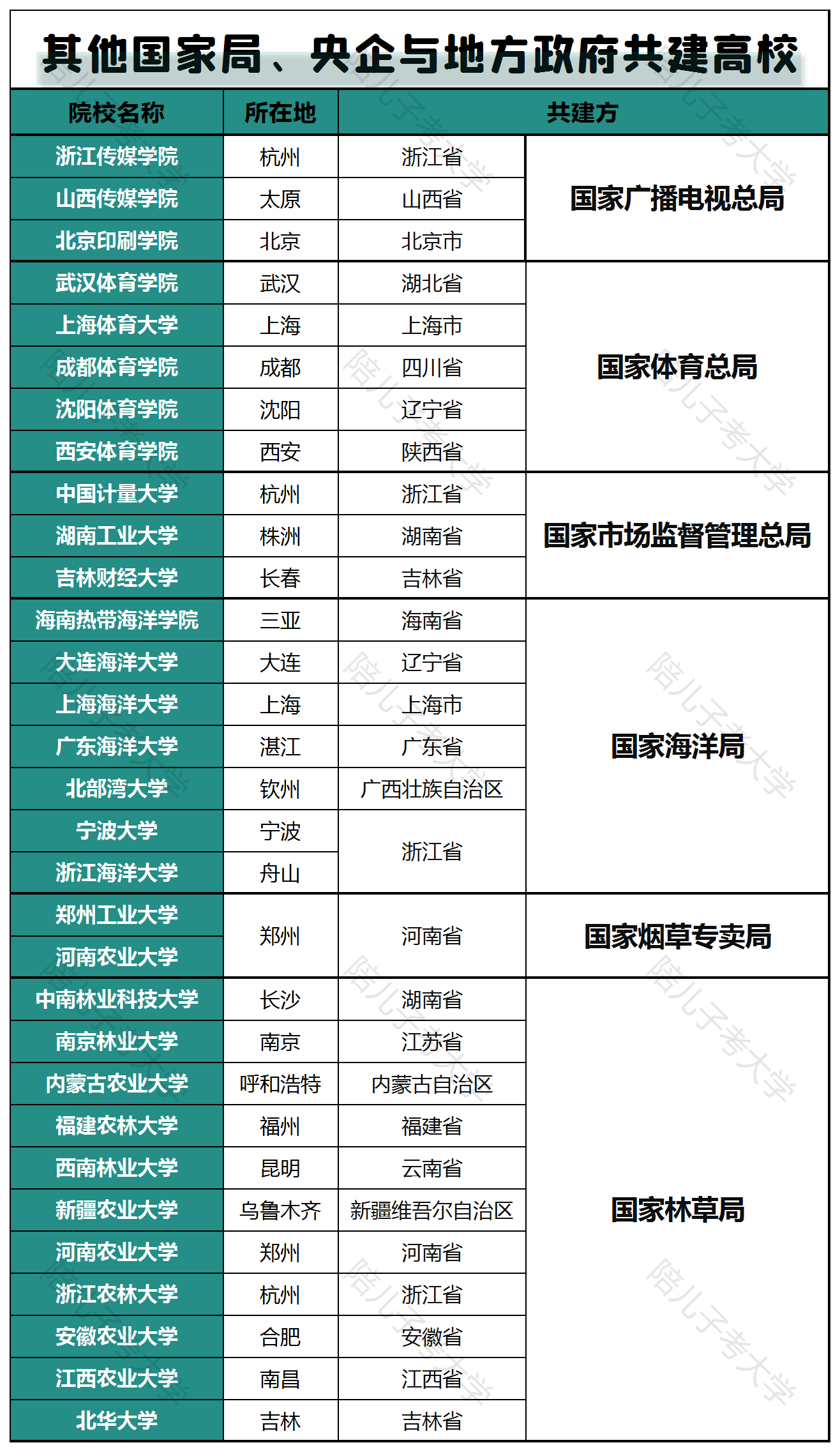 从共建关系上来分类,主要分为以下几种:教育部直属并与地方政府共同建设的高校,其他国家部委直属并与地方政府共同建设高校,省属重点高校并与各行业部委(总局)共建高校,地方政府重点建设高校。