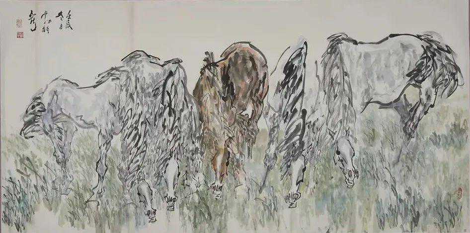 刘勃舒五马图纸本设色123cm×247cm2012年
