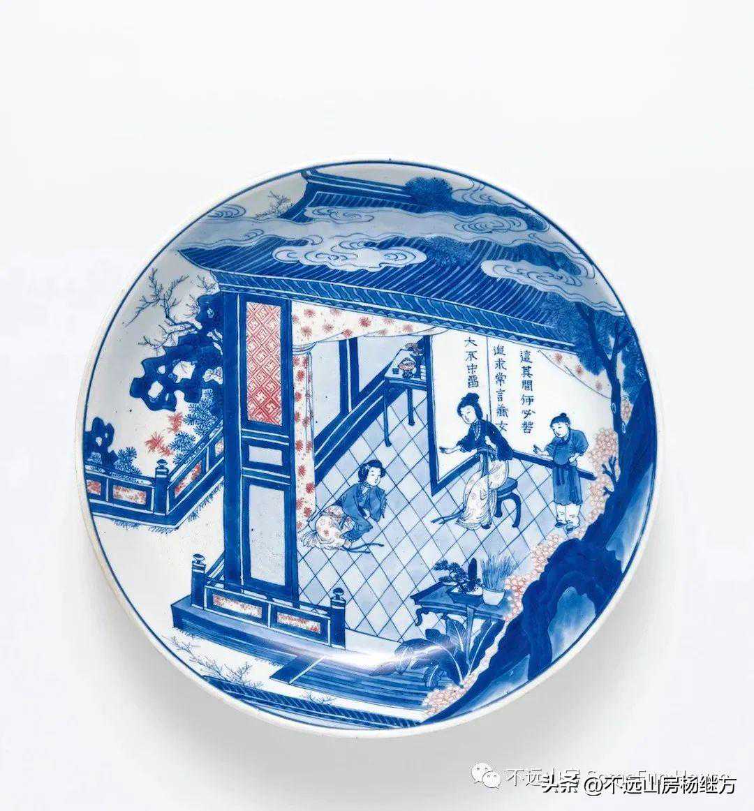 美国觀鹭園主人旧藏的康熙早期青花釉里红西廂记拷红大盘,情节生动,尤其红娘曲词「这其间何必苦追求,常言道女大不中留」起点睛之效。