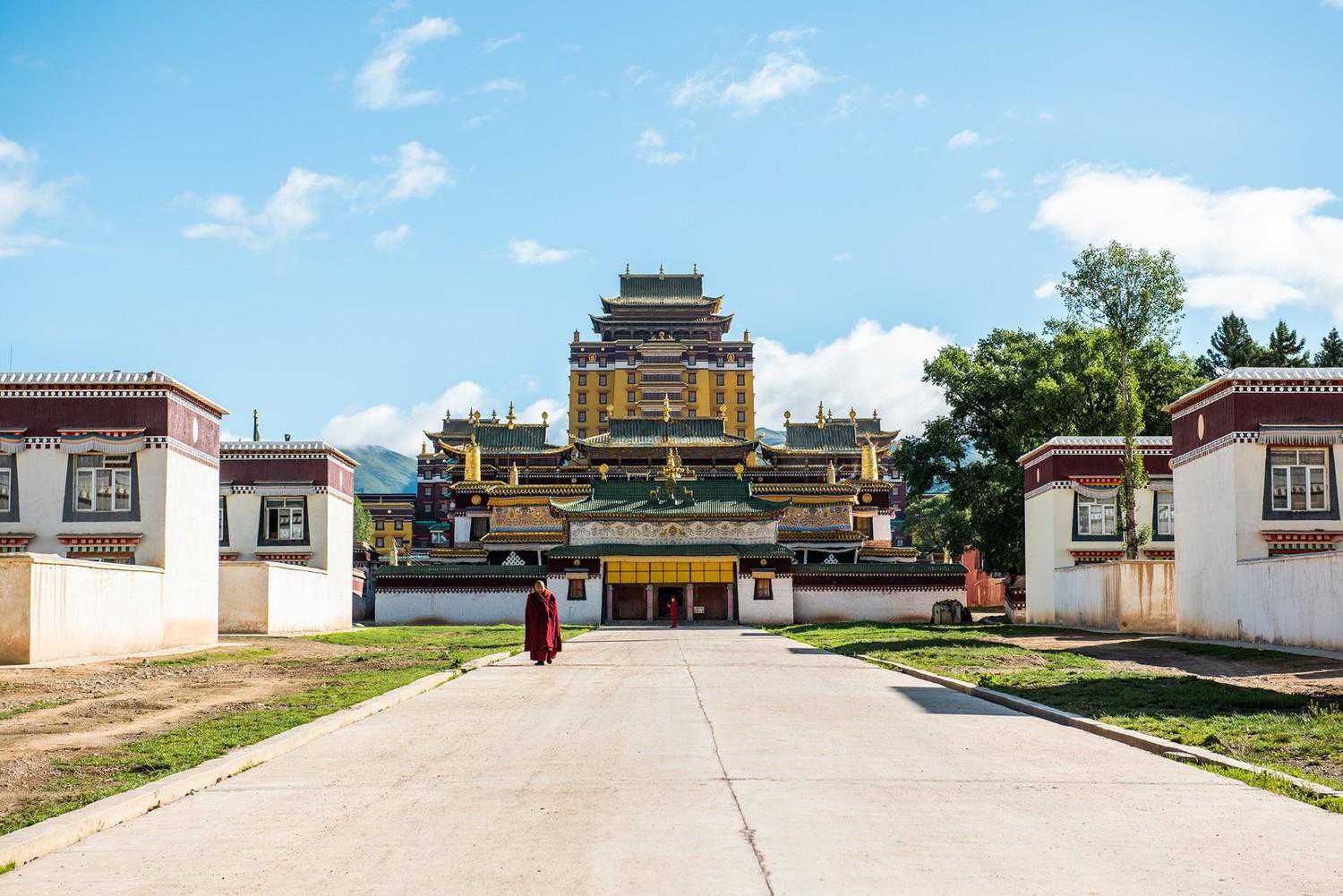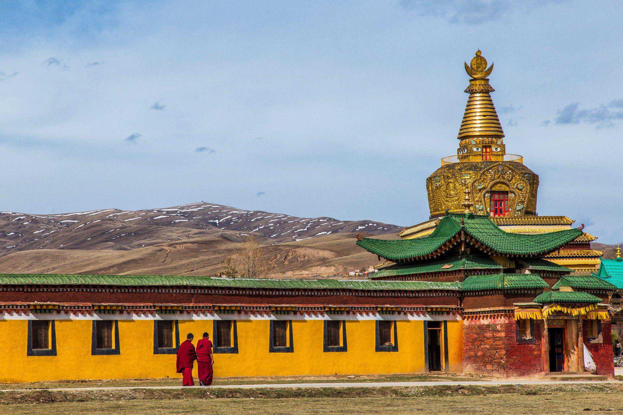 那是年保玉则还没有封闭的时候,我们行至阿坝州阿坝县的各莫乡,远远就瞧见草原深处有一建筑,像极了米拉日巴佛阁。同行的领队介绍远处是各莫寺,藏语叫各莫贡巴,在当地享有盛誉。正好当天的行程不是很紧张,我们得以进去参观。