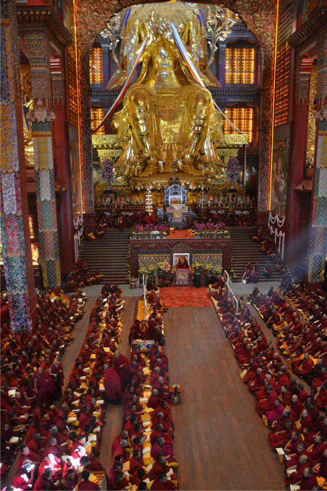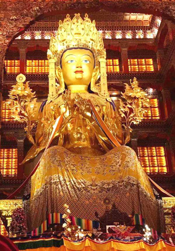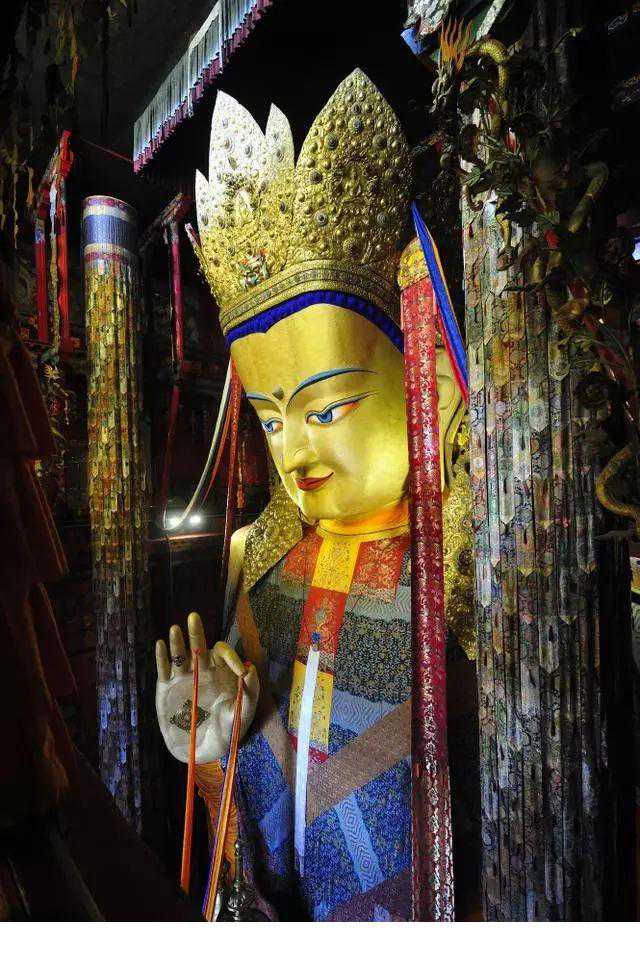 为什么叫弥勒殿?是因为殿内主供弥勒佛,也叫强巴佛。之前去过日喀则的扎什伦布寺,扎什伦布寺内也有一处弥勒殿,不过在扎什伦布寺被叫做强巴佛殿。扎什伦布寺强巴佛殿内供奉的强巴佛是世界最大的,被大世界基尼斯纪录认证过的。其高26.2米,肩宽11.5米,耳长2.2米,仅眉宇间镶饰的大小钻石就有32颗,珍珠、琥珀、珊瑚、松耳石有1400多颗。耗时四年塑造完成,共耗费黄金6700两,铜23万多斤。