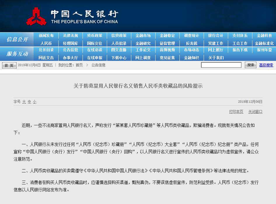 对此,人民银行明确表示,从未发行过任何“人民币(纪念币)珍藏册”“人民币(纪念币)大全套”“人民币(纪念币)纪念册”类产品,任何宣称“中国人民银行(央行)发行”“中国人民银行(央行)回购”,以人民银行名义进行宣传的人民币类收藏品均为虚假宣传。
