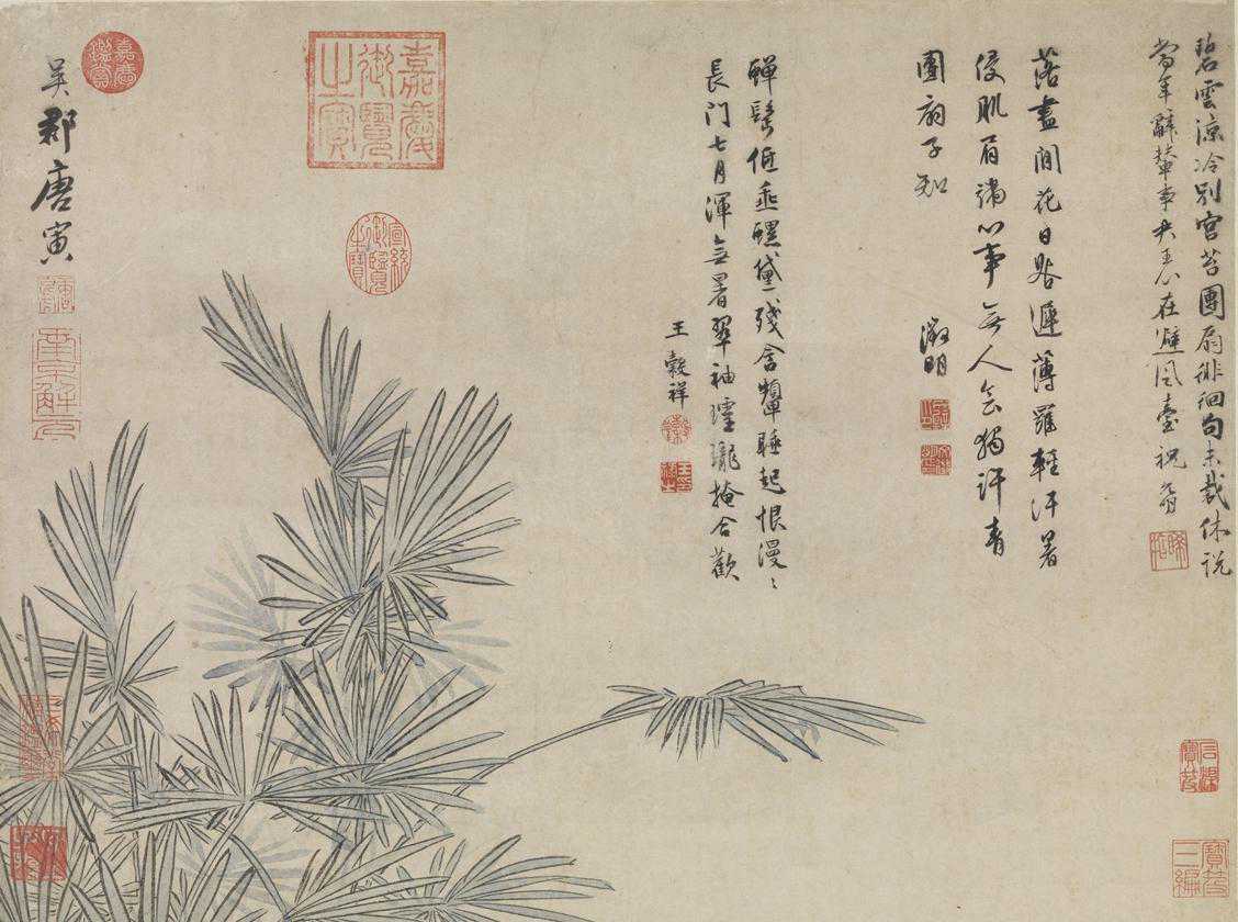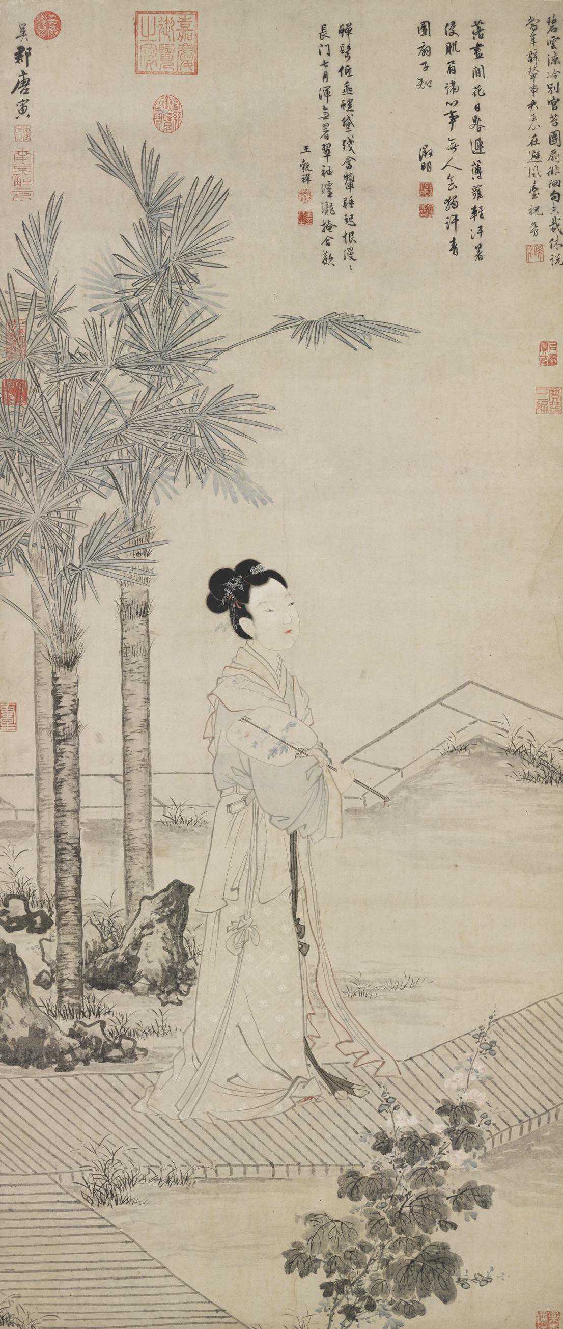 本幅取材自汉班婕妤的《怨歌行》:“常恐秋节至,凉飙夺炎热,弃捐箧笥中,恩情中道绝。”榈树下,班姬持扇伫立,庭前复植有蜀葵,点出夏末时令。幅中画花用没骨法、仕女脸部的三白法,均与杜菫“玩古图”极近,据此可观测唐寅的风格源流。