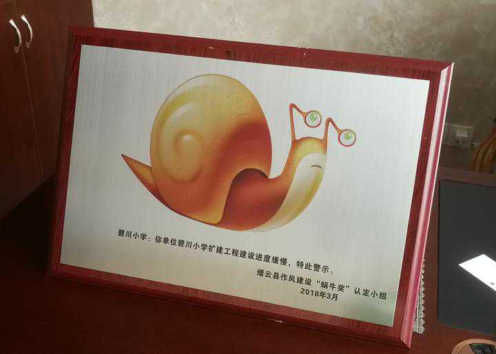 相比“奔牛”“骏马”这样闪光的奖项,蜗牛的形象总是与迟缓拖沓联系在一起。在两个月前,3月20日召开的全县作风建设深化年活动动员大会上,表彰了综合考核先进单位后,还首次对怠政单位颁发了“蜗牛奖”。碧川小学和欣达城建开发公司由于负责的项目推进不力,成了首批“蜗牛奖”得主。
