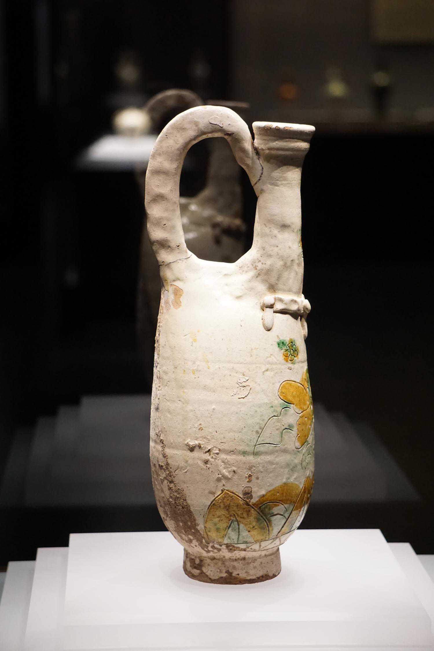 鳝鱼黄釉雕几何纹穿带扁壶辽