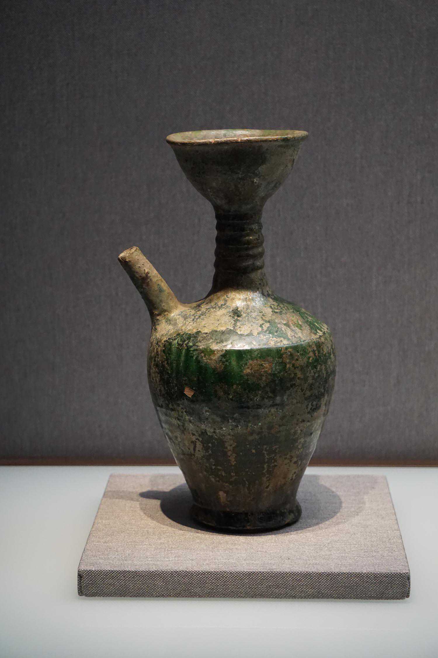 白釉绿彩皮扣装饰单孔鸡冠壶辽