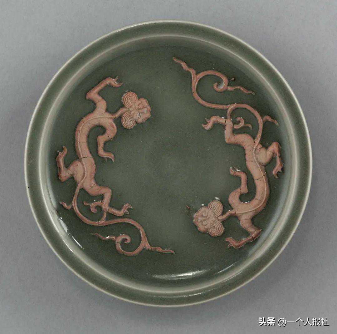 元龙泉窑青釉露胎贴塑云龙纹盘