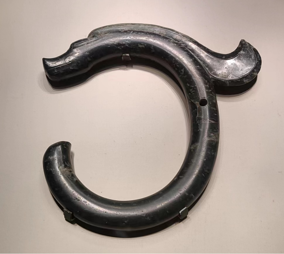 龙首形似兽,耳贴于颈部,上唇厚大,下唇尖细,嘴部镂空且刻有齿纹。璜身多饰以弧线勾连而成的龙身。