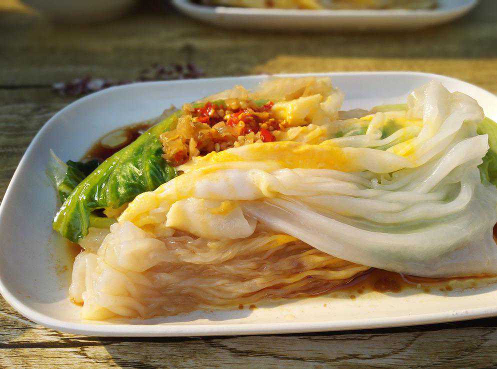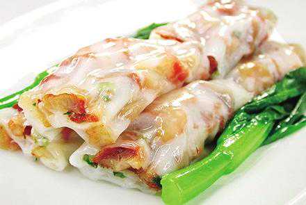 把蒸炉加满水,大火烧开(蒸肠粉时一定要开大火),肠粉盘刷上食用油,再放入米浆摇均匀放入肠粉架蒸30秒左右再加入馅料再蒸5秒加入青菜,再蒸5秒左右即可拉出,然后把肠粉皮分两半刮起卷皮条形放入碟子浇上汤汁、酱油汁、葱油、蒜油即可出品。