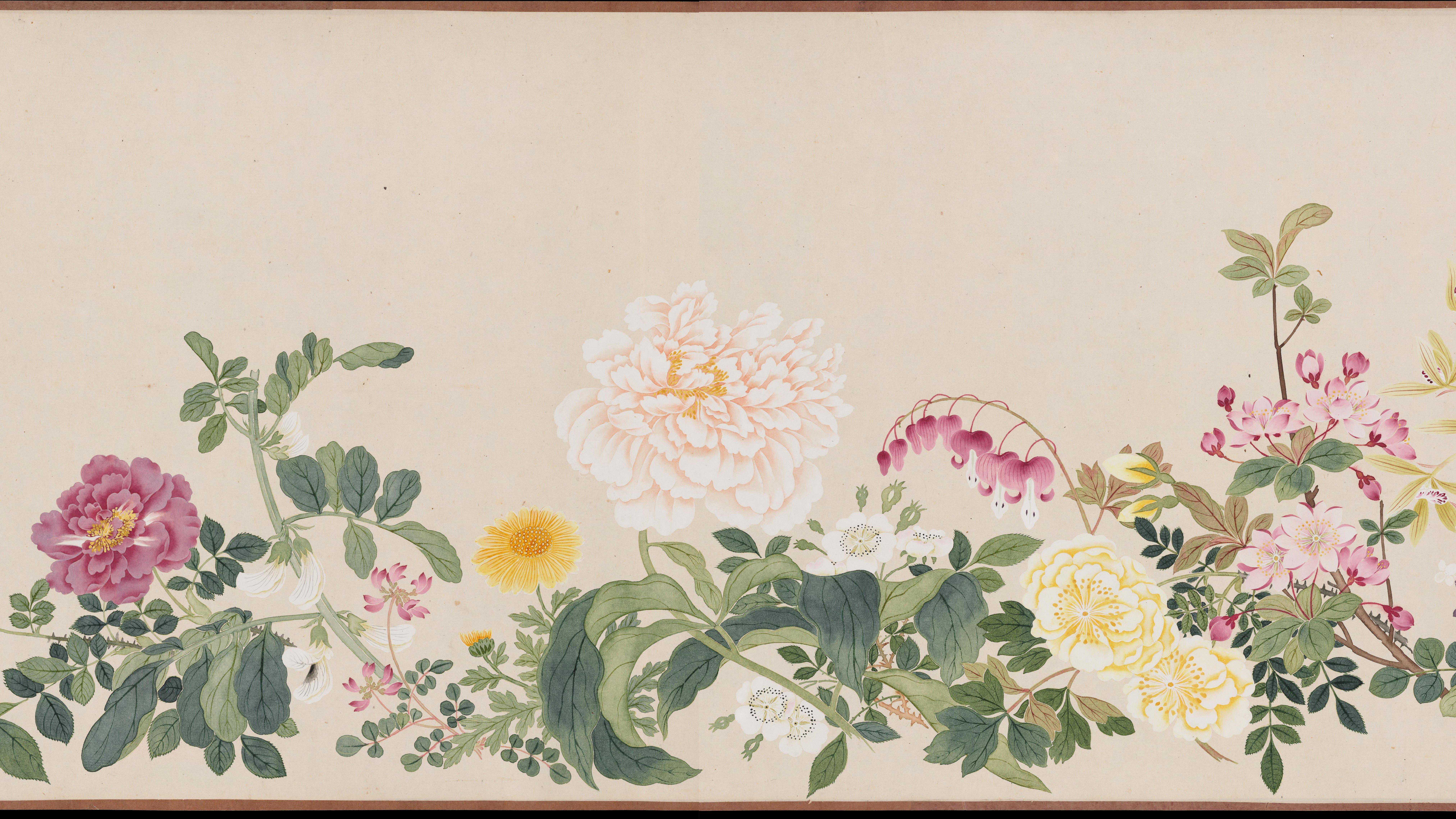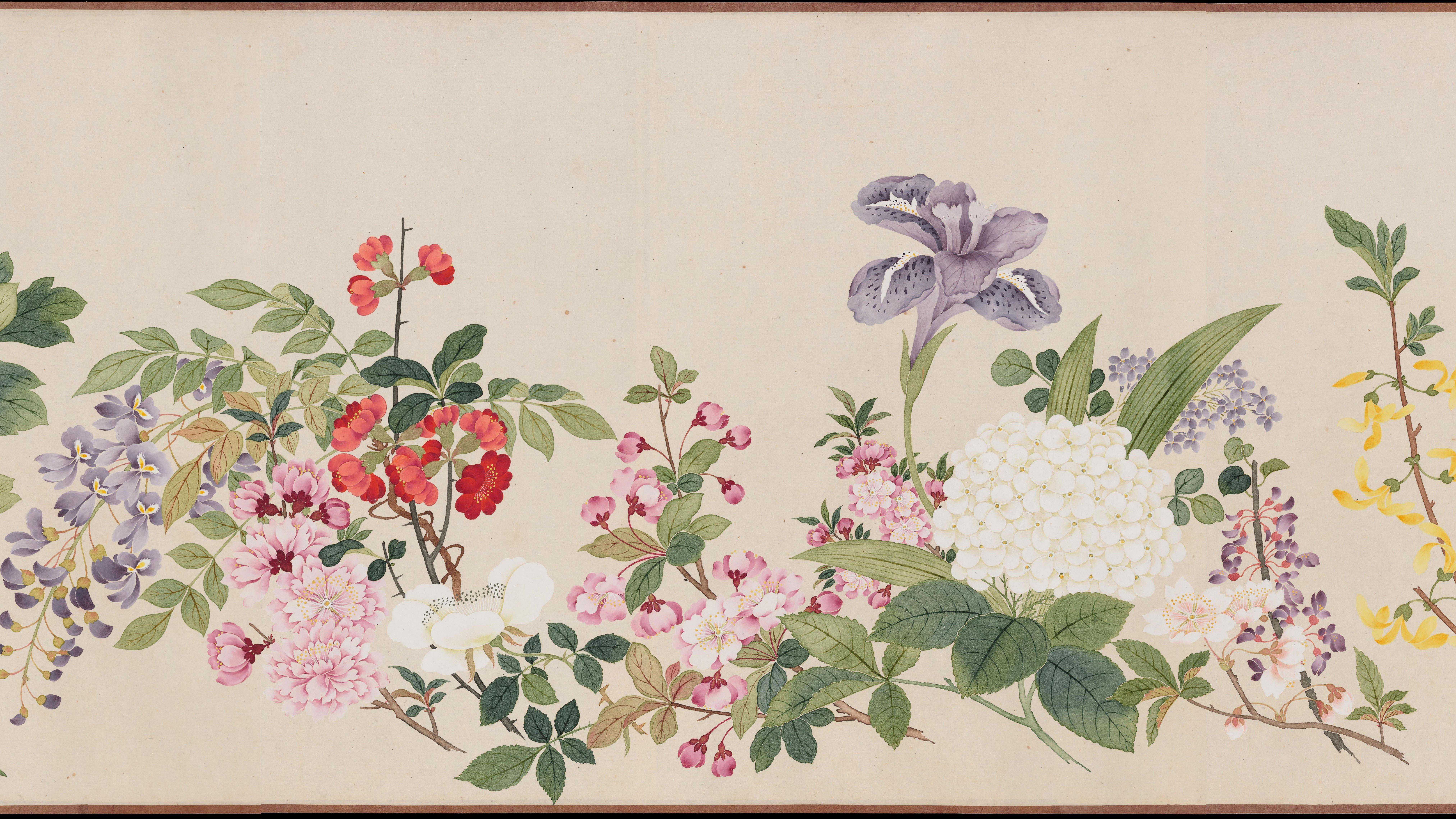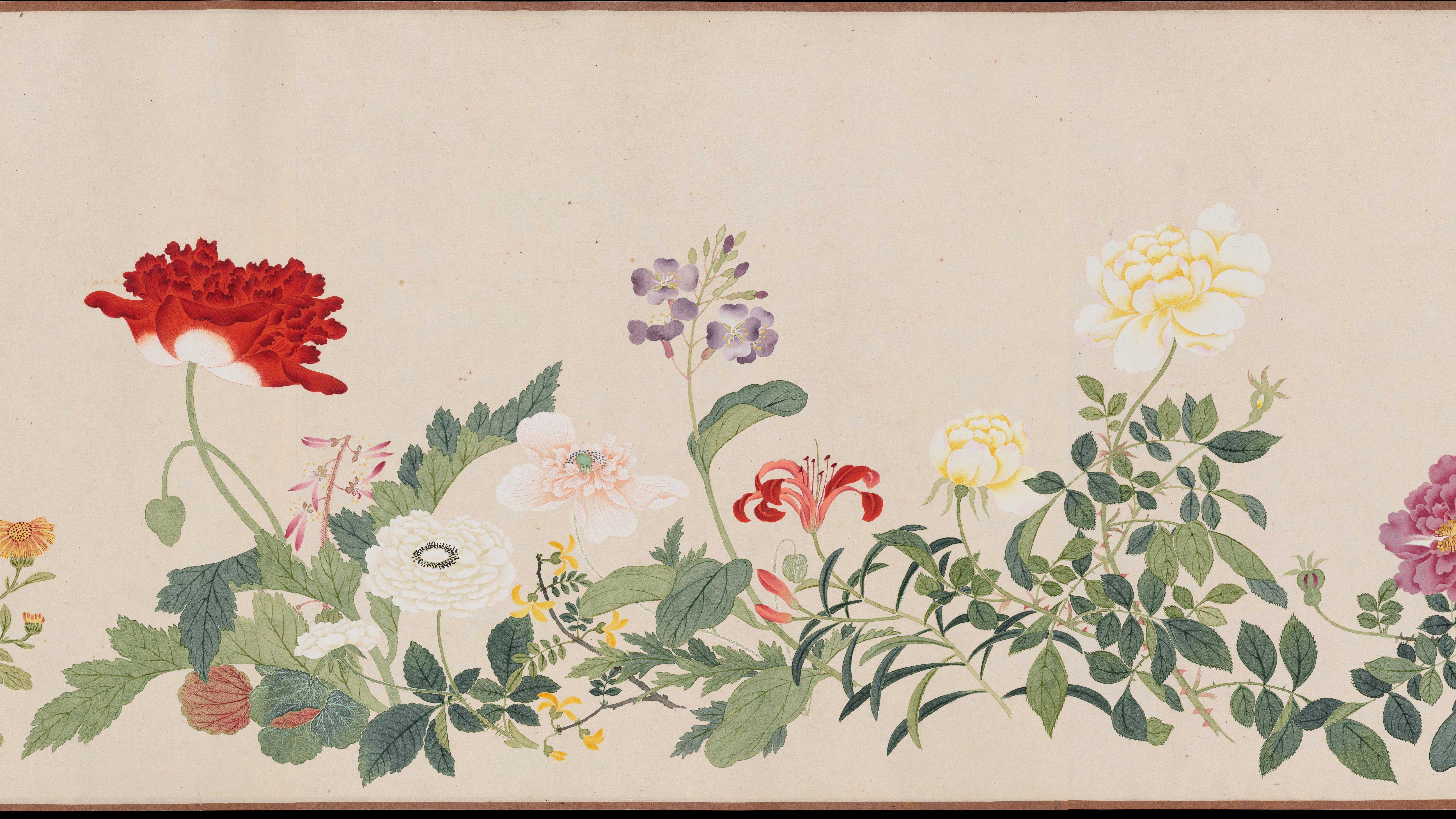 此图卷由清代画家钱维城绘制。画卷以折枝的方法将生长于不同时节的几十种花卉,密密匝匝地按大小依次穿插,整齐地排列在画面中。以没骨法绘写花叶、花瓣,形态逼真。钱氏画风以干笔勾勒,重视烘染,笔墨浑然,用笔缜密,以青绿、赭石相间设色,极富宫廷富贵气息。此卷现藏于美国波士顿美术馆。