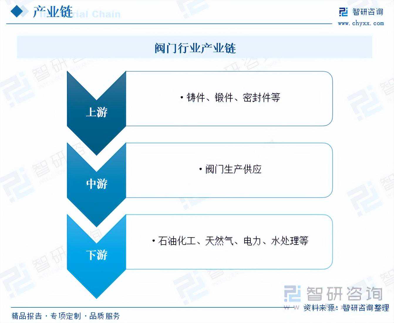 阀门行业产业链上游为原材料供应环节,主要包括铸件、锻件、密封件等;中游为阀门行业生产供应环节;下游主要应用于石油化工、天然气、电力、水处理等领域。