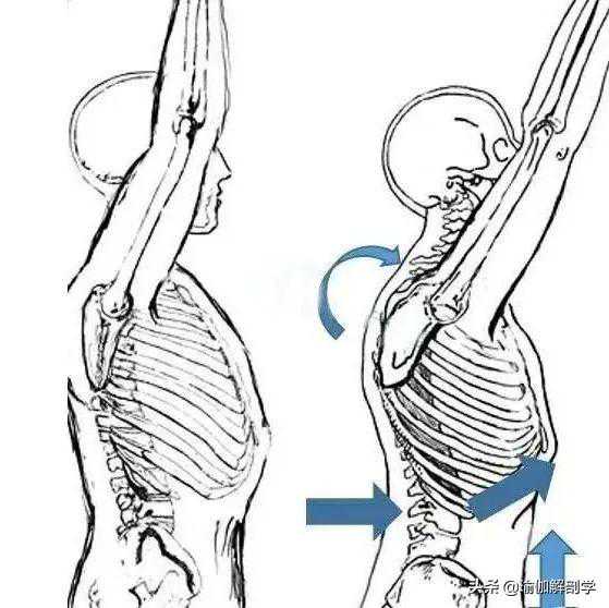 而且,还会导致抬手臂受限,尤其是抬手臂上举150度左右,肩关节就卡住了,或者手臂上举过头,肋骨就突出了,很可能就是背阔肌的问题。