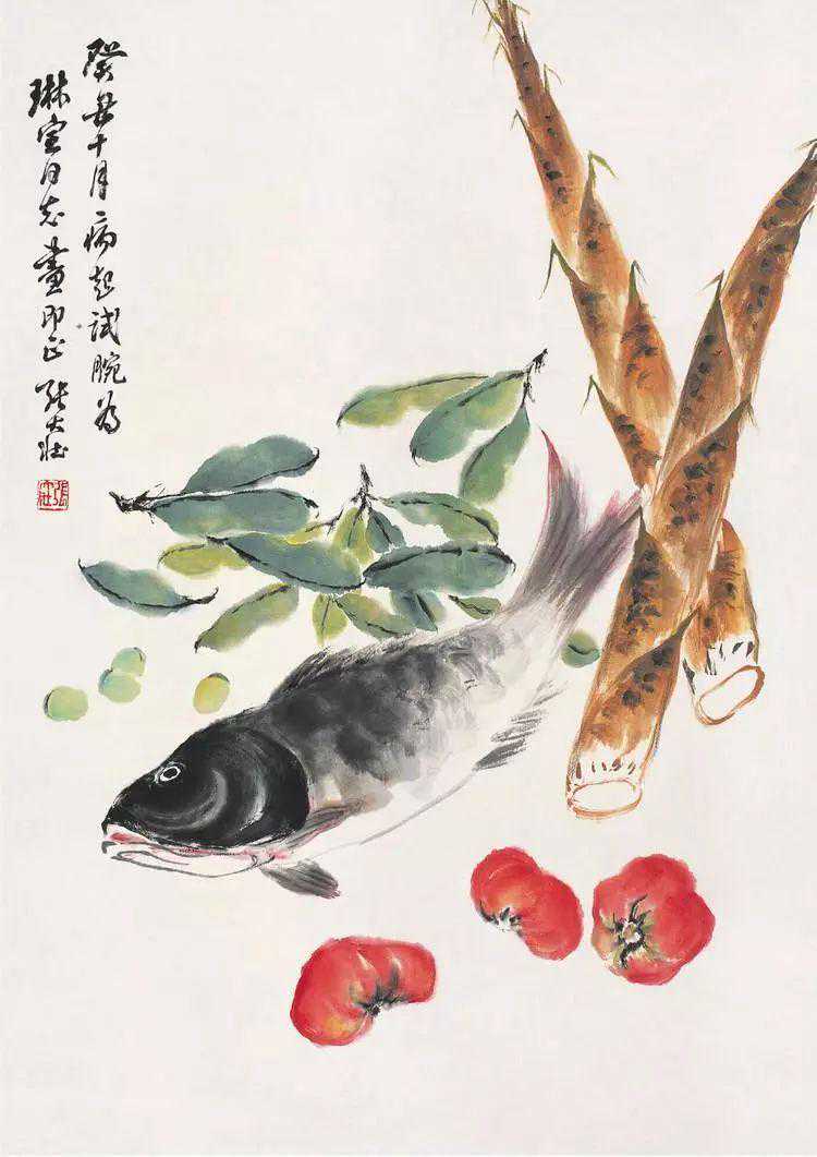 张老又握笔,隶篆相间,在带鱼下面加写一段跋语道:“此帧画成,旁观者俱欲得之,卒为老菜根所有,翰墨因缘如此。”书写“老菜根”三字时,特意停下笔,问我同意否?当获得肯定的答复后,他才将跋语写完。因为笔者姓名与此谐音,张老偶尔也爱开个玩笑,故有此问。