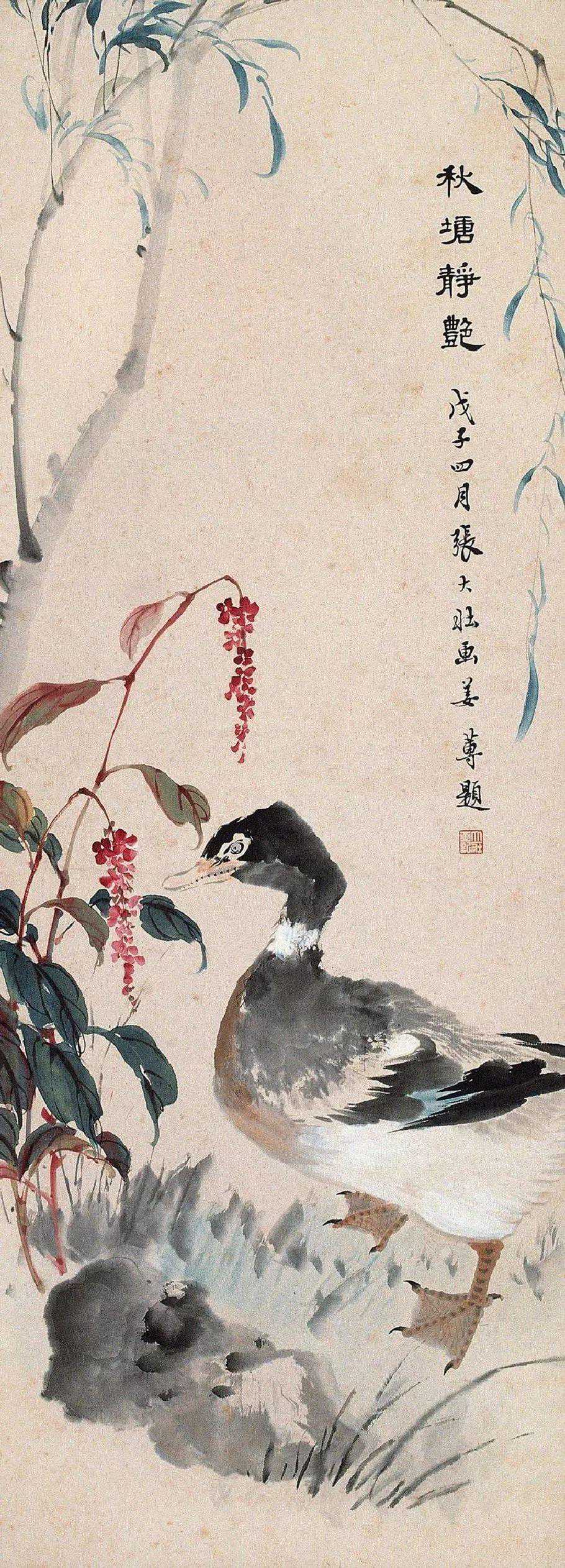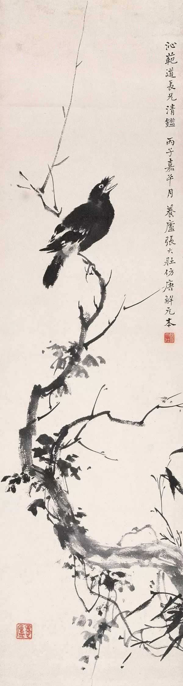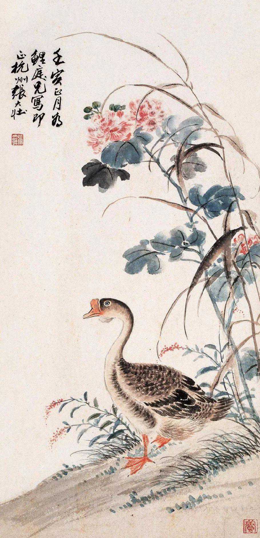 张大壮晚年,一天晚间,张的学生、朋友来了五六个人,话题谈及中国画构图,有人说,物象安置画幅当中,乃构图大忌。大壮先生不以为然,他认为处理得当,仍是一幅好画。于是由闲谈发展成争论,争论到最后,座间众人一致意见:“你张先生既力排众议,就请当场挥毫,如何?”出乎大家意料,张先生一边走向画桌,一边嘟囔:“画就画,有何难哉!”