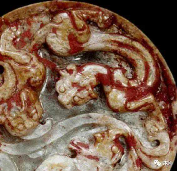 主要受殓葬的朱砂所沁。朱砂沁入玉里的速度很慢,大都附在玉器的纹饰处、镂空等凹陷和粗糙处,将附近的玉皮染红。若将白玉的玉肌沁成深红色,得要1800年左右的时间。