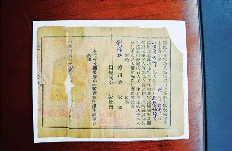 抗战票证展上,一张由八路军总司令朱德、副总司令彭德怀签发的“秘密抗日志士证明书”,引人注目。这张证明书见证了当年隐蔽在武乡日伪警备队里红色特工刘福柱的传奇故事,他“公开投敌”秘密锄奸传递情报,他智勇双全,忍辱负重,不顾个人安危,为民除害,他母亲临死前都骂不该生了个汉奸儿子。1946年土改时,刘福柱差点误当汉奸被处决,从他家搜出了这张《国民革命军第八路军总司令部敌占区秘密抗日志士证明书》,方才真相大白,这催人泪下的故事令人敬佩。