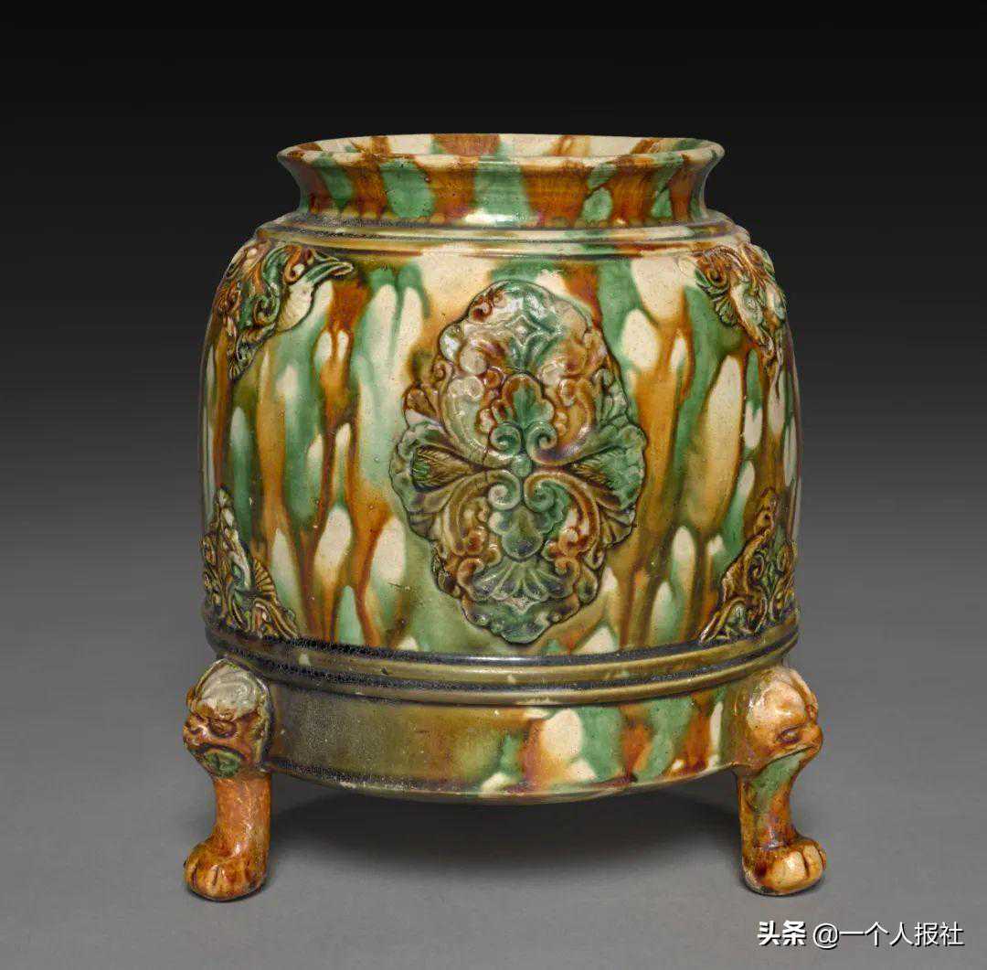 唐巩县窑三彩贴塑带流罐