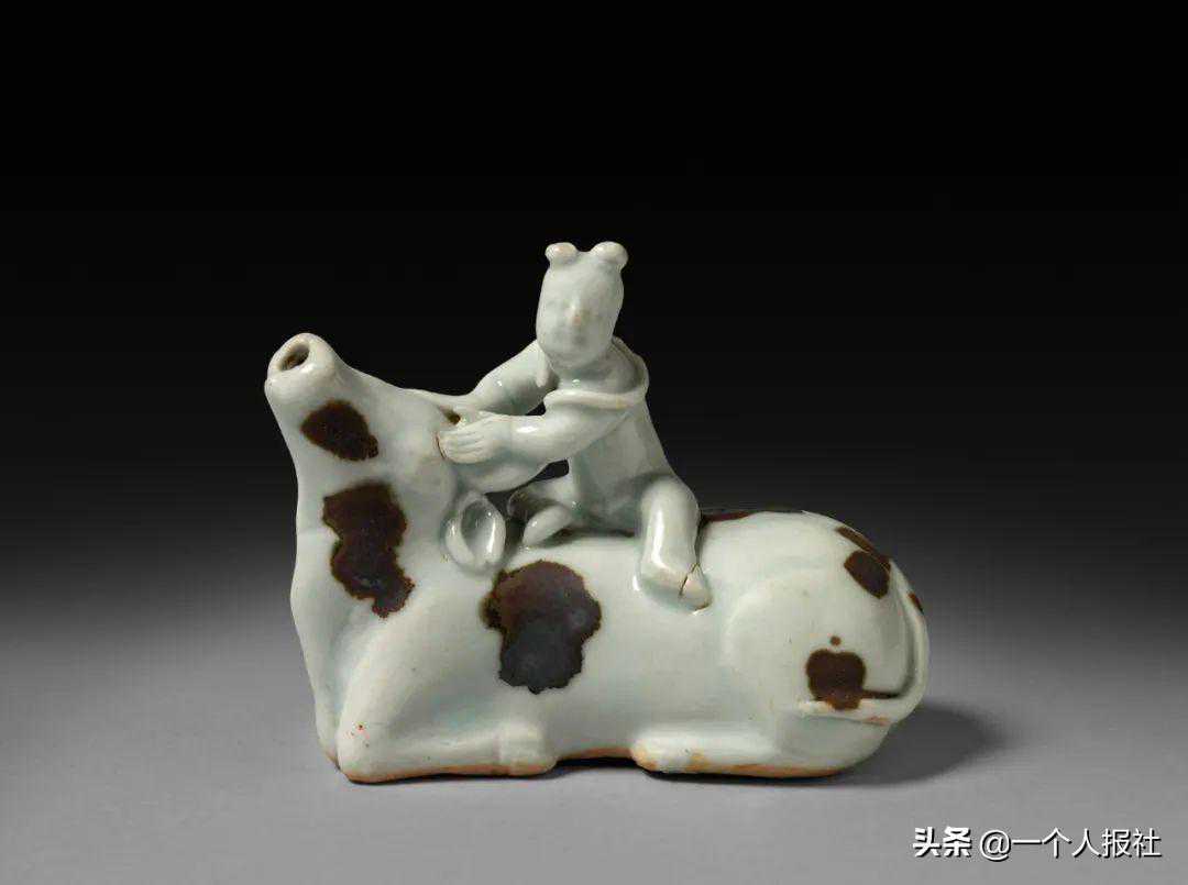 元湖田窑青白釉点褐彩童子执牛瓷塑