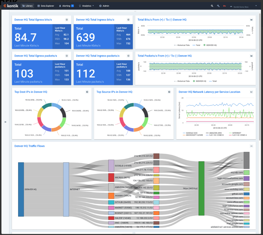 KentikPlatform是一个AIOps平台,可将人工智能和机器学习功能应用于网络流量分析。该解决方案可分析下游和中转流量,帮助企业识别对等机会,优化网络路由,并更好地控制其服务性能。它们还提供网络流量工程功能,以最大限度地提高资源利用率和流量,并深入了解网络容量,从而帮助推动经济高效的流量。