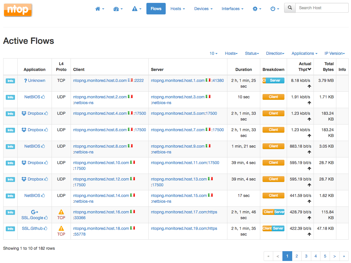 ntopngntopng是一个开源网络流量探测和分析工具。流量探测器将网络流量分类为不同的标准,包括IP地址和吞吐量。通过表征网络流量,企业可以轻松确定影响网络的不同网络统计信息;该解决方案可以在此分析中引用实时和历史流量数据。虽然ntopng的社区版本是开源的,但也可以使用专业版和企业版。