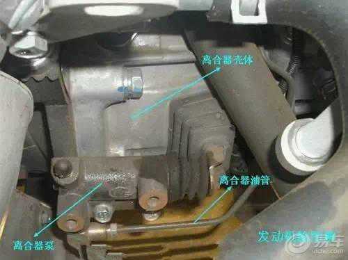 离合器总泵:踩下离合踏板时,连接在踏板上的离合器总泵会动作,产生液压力,沿管路传递到离合器泵上,最后转化为机械力分离离合器。小F的离合器操作系统是液压的,与制动系统共用一种液压油,所以有一条管子连接到了制动液罐里。