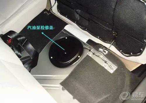 再来看看汽油泵,后排座椅掀开后,会看到这样一个黑色的盖子,它的下面就是汽油泵。
