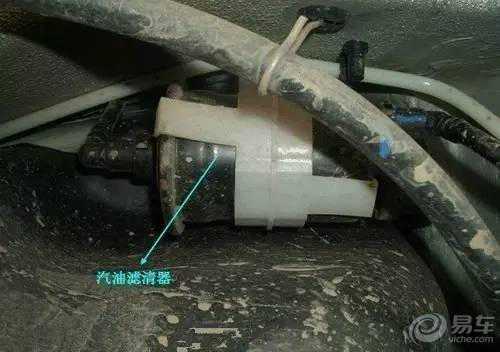 汽油滤清器:安装在右后轮前方,油箱旁边,作用是滤除汽油中的水分、杂质和胶质,防止燃油系统堵塞,保证燃油供给装置的正常工作。