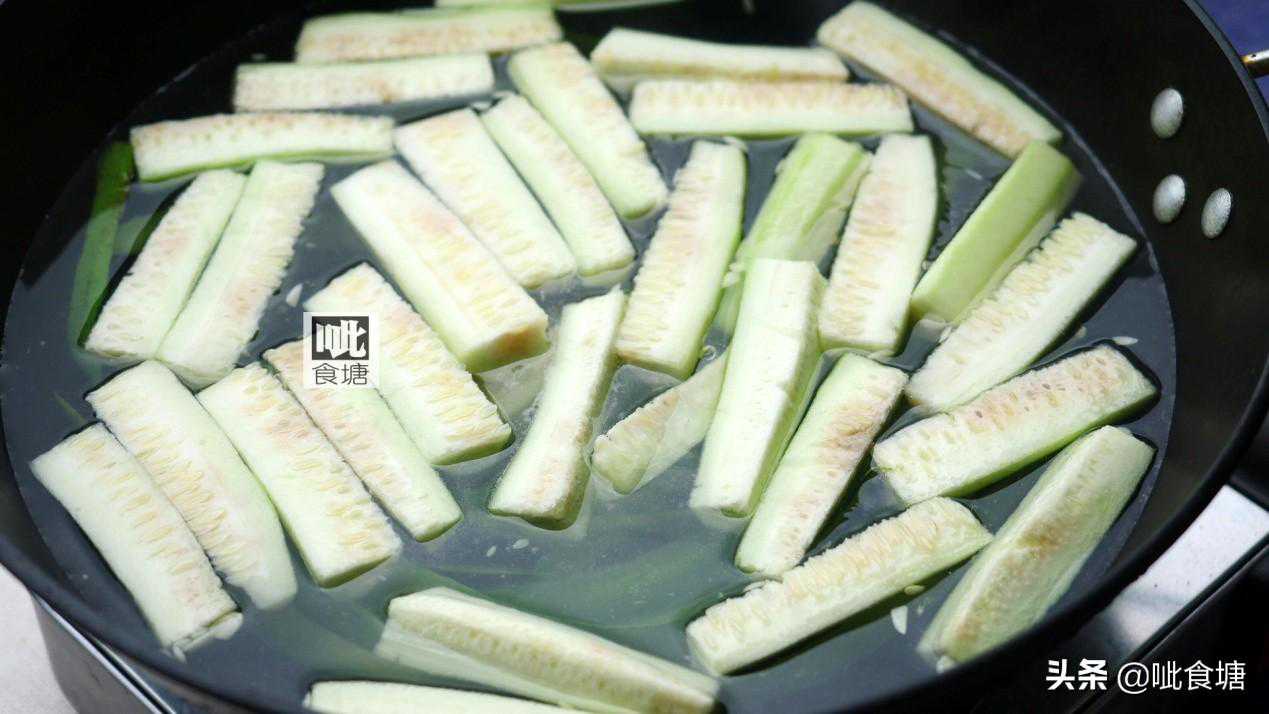 5,然后浸泡凉水,冷却降温,也能让丝瓜皮保留一点点的脆爽