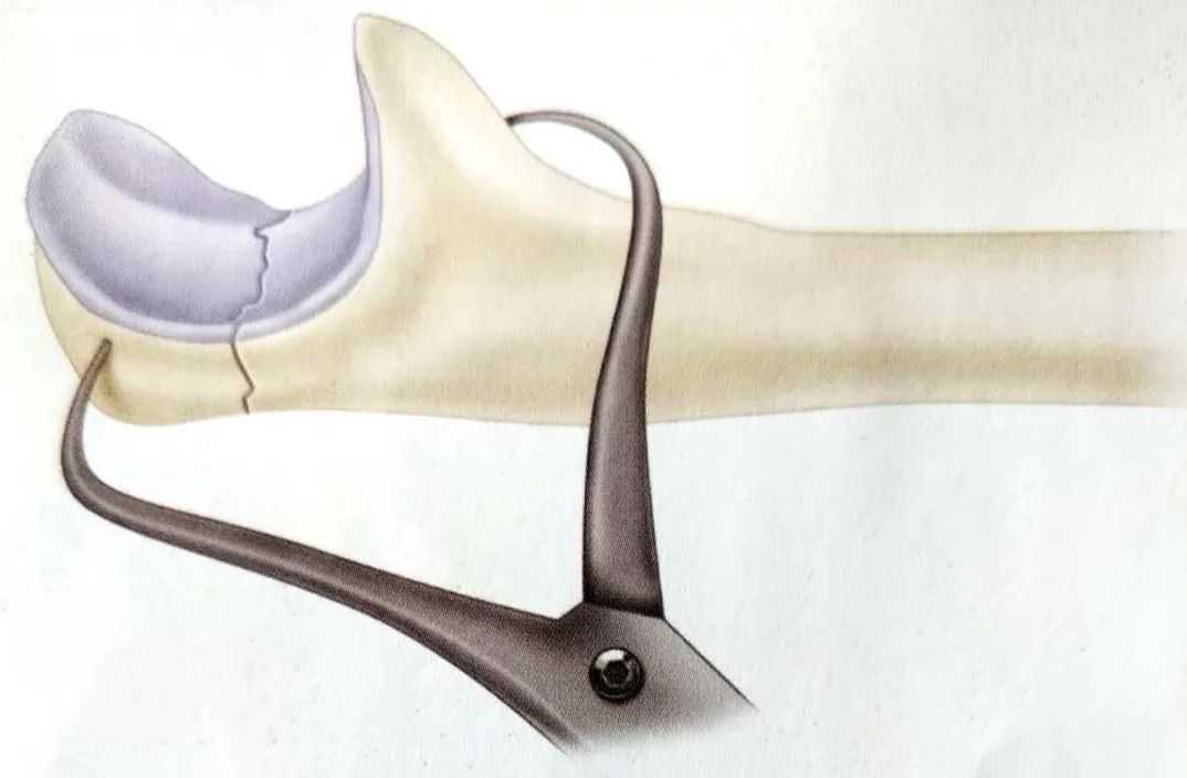 克氏针常被用于锚定张力带,其风险是可能对前臂的血管神经造成损伤。推荐采用髓内螺钉结合张力带,据报道,克氏针穿过骨皮质比在髓内放置更能增加稳定性和减少并发症。