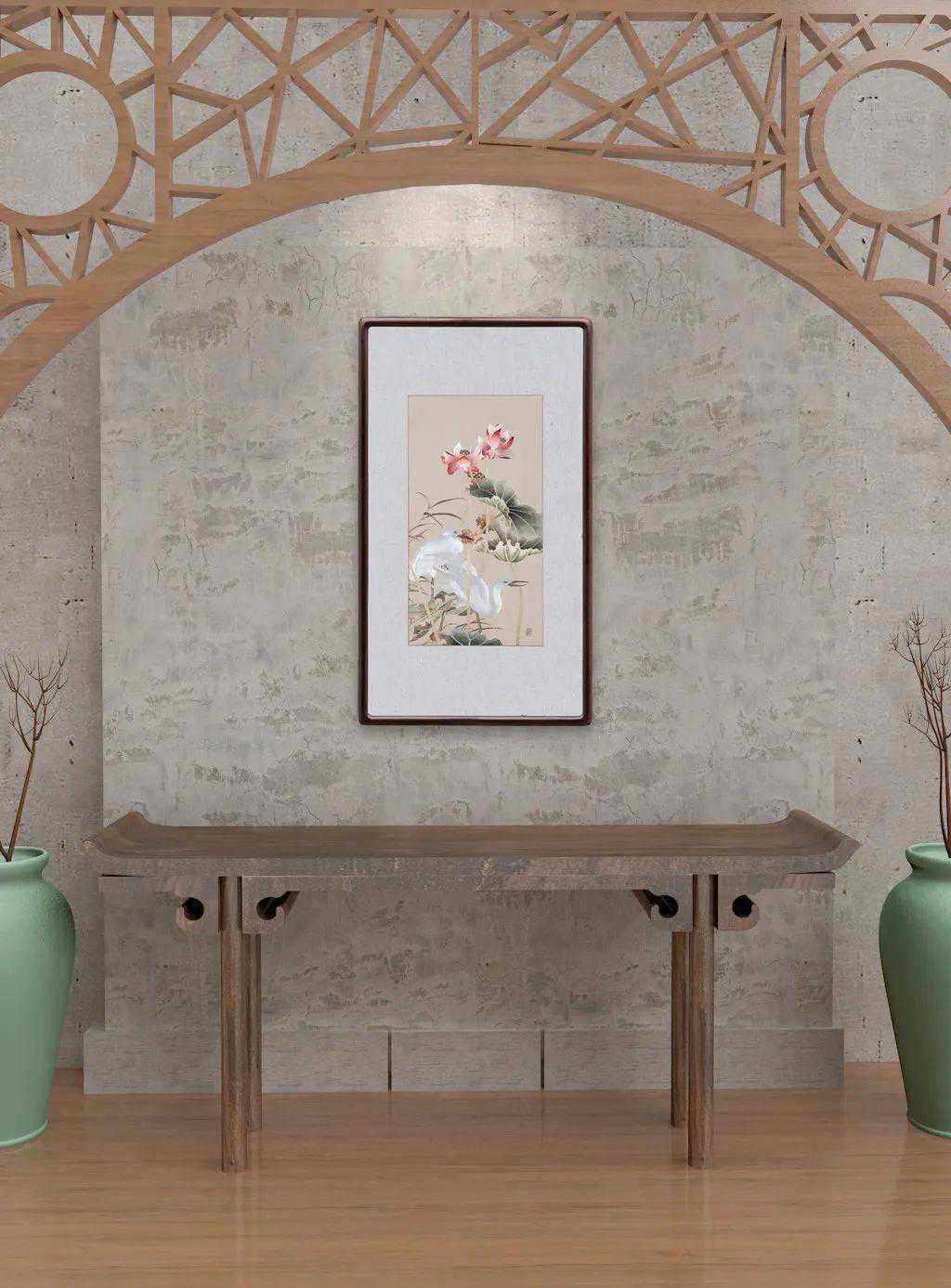 近代著名画家陈之佛的《白鹭荷花》,以工笔绢本作荷花,极其韵致高雅。作者巧妙地以白鹭粉花与秋老之叶形成对比。全图色调处理极其高超,营造出一种俊逸、静谧的氛围。