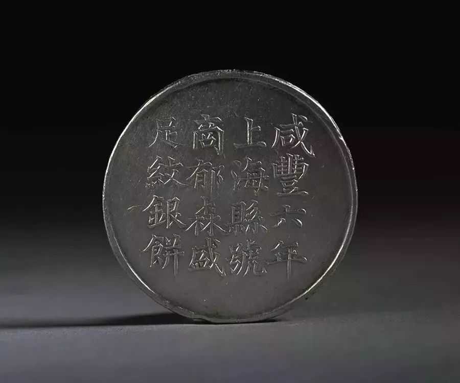 △清咸丰六年上海县郁森盛银饼,径4厘米,铭文:正面“咸丰六年上海县号商郁森盛足纹银饼”,背面“朱源裕监倾曹平实重一两银匠丰年造”