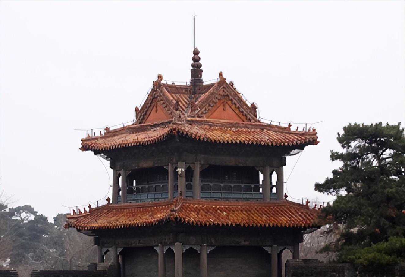 角楼十字脊式屋顶,正中有一琉璃宝顶,即一社葫芦,寓意“陵寝平平安安”。角楼登高12.54米,四面出廊,正中有栱门,门为对开,二楼四面有窗,角楼内有二层楼梯可以上下,内外均装饰彩画。