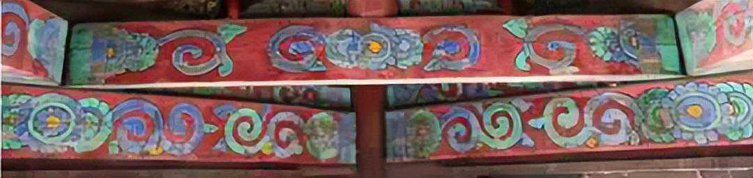 角楼内檐也保留了珍贵的三室珠吉祥草彩画。朱红基地上,青绿相间设色,拉小线,黑色勾勒,两端有箍头。构件三看面均为直线型构图。