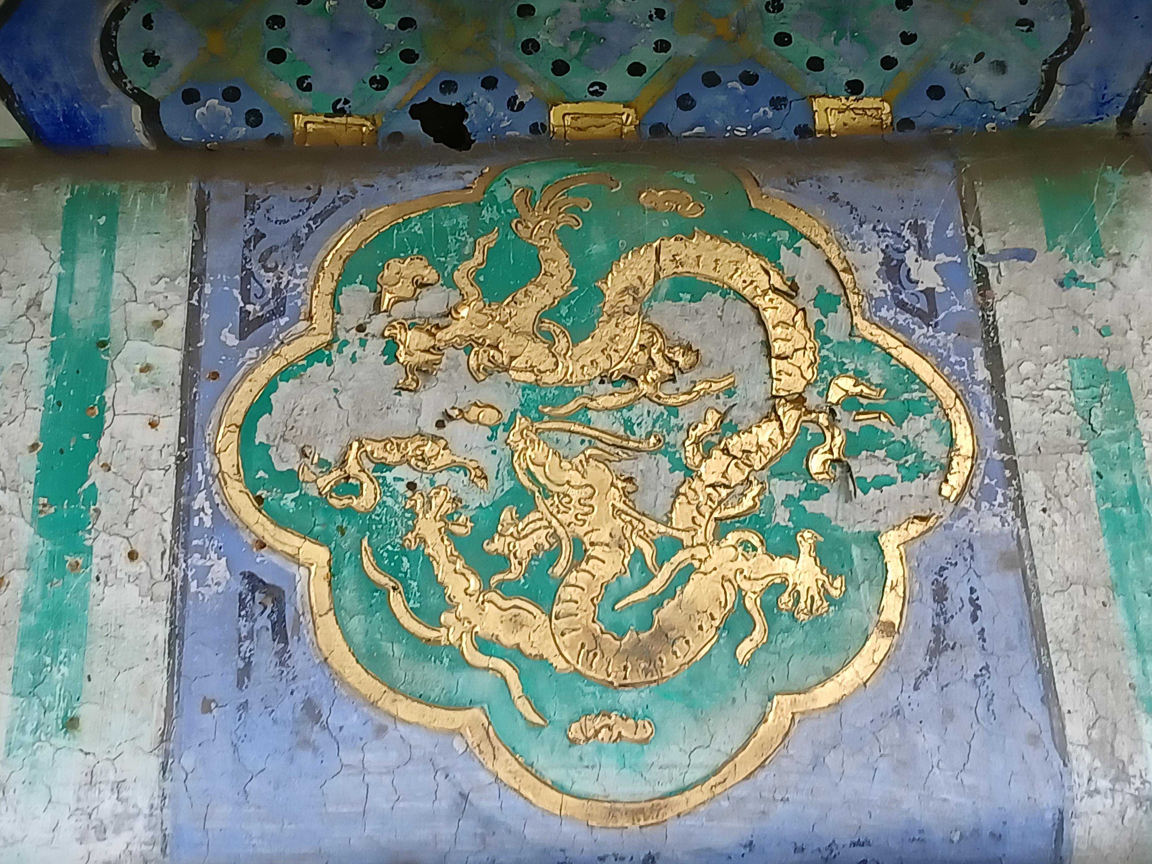 外檐彩画部分,东南角楼及西南角楼外檐彩画脱色较严重,仅存金部分。地仗也有部分脱落,破裂。从现状仅可批断一重檐为大点金旋子彩画。东北角楼及西北角楼外檐彩画经过重绘,保存较好。外檐彩画为烟琢墨石碾玉旋子彩画,内檐则保留了珍贵的三宝吉祥草彩画。