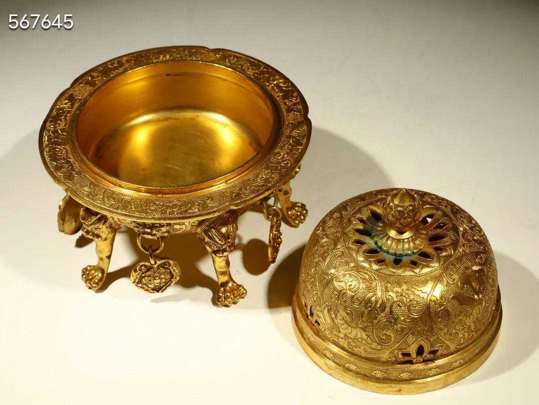 旧藏,铜鎏金錾刻瑞兽穿花五足炉。