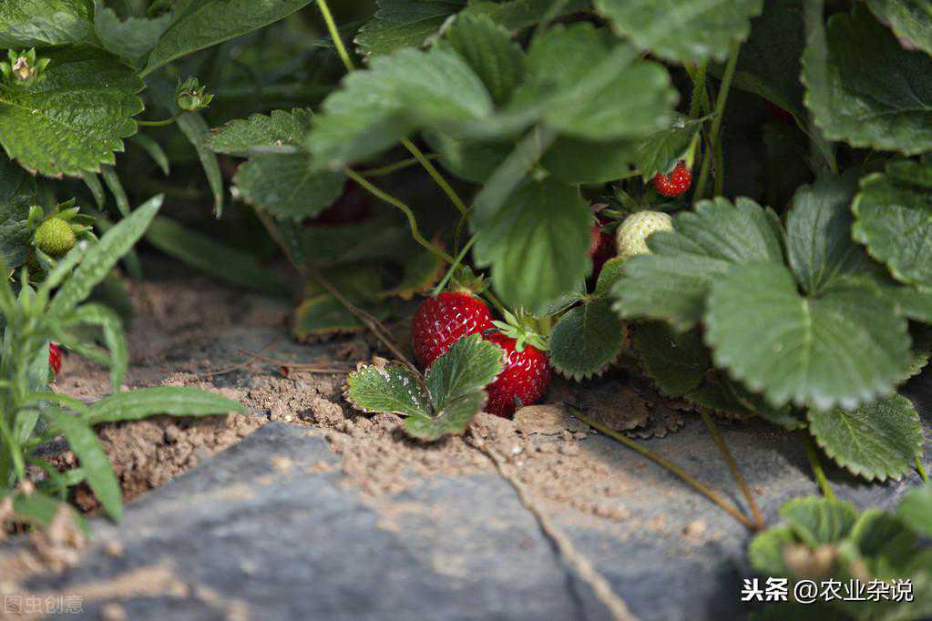 (3)培土由于草莓根系分布较浅,经过一年生长之后,根状茎上部的新茎部位上移,使须根外露,出现类似韭芽的“跳根”现象。新根外露时间太长,就会影响植株的生长发育和对养分的吸收,严重的导致植株干枯死亡。因此,对于两年生的草莓园,特别是垄栽草莓,应在浆果采收后,初秋新根大量发生之前,结合中耕除草,及时进行培土,以促进新根发生。培土厚度以露出苗心为准。培土前也可结合撒施些有机肥,再用土盖住,这对于新根的产生和养分的吸收以及来年的产量更为有利。