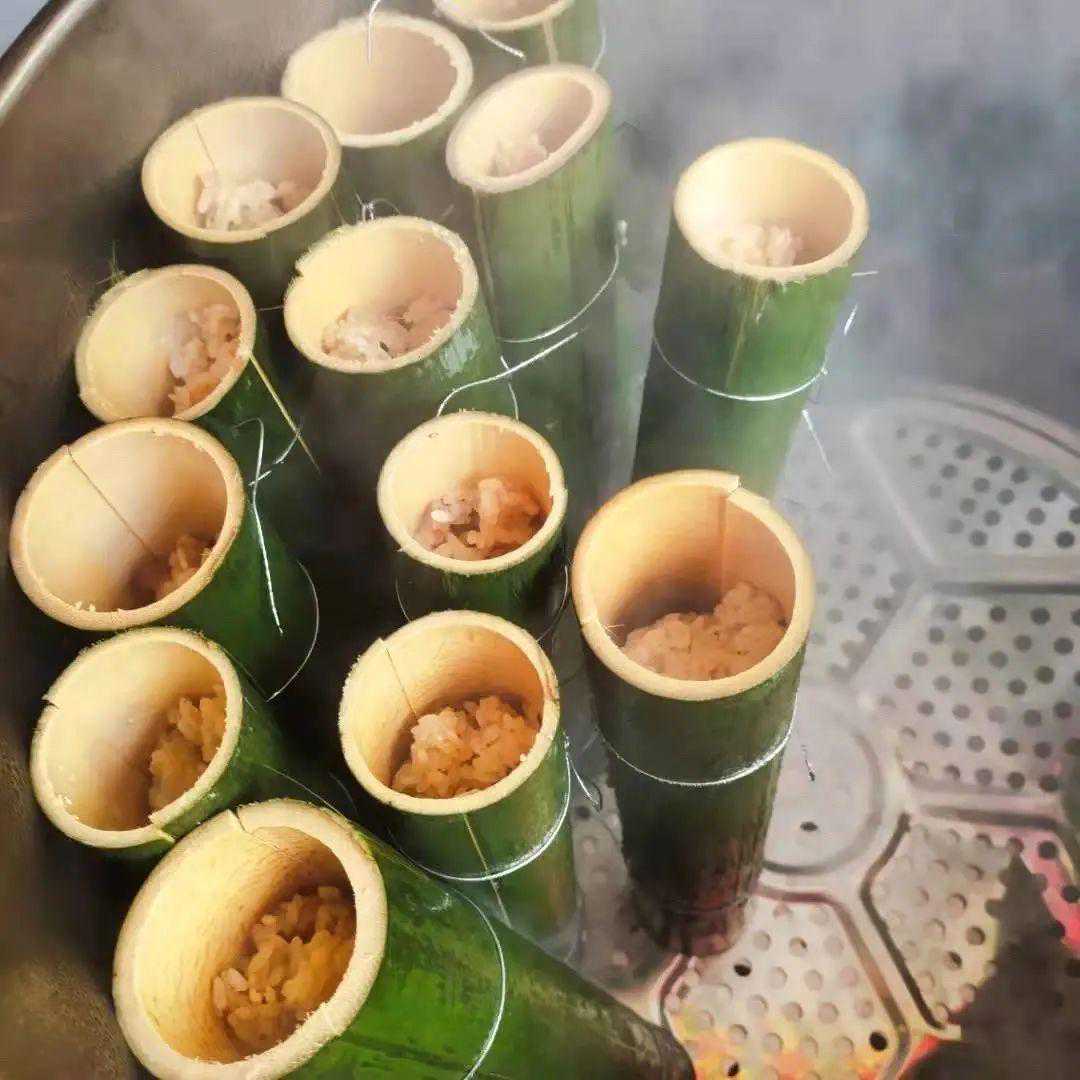 挑选合适的竹子,装入适量的米和肉、以及调味料。将其烤熟后,劈开竹筒,米饭被竹膜所包,香软可口,有香竹之清香和米饭之芬芳,还有腊肉的飘香。