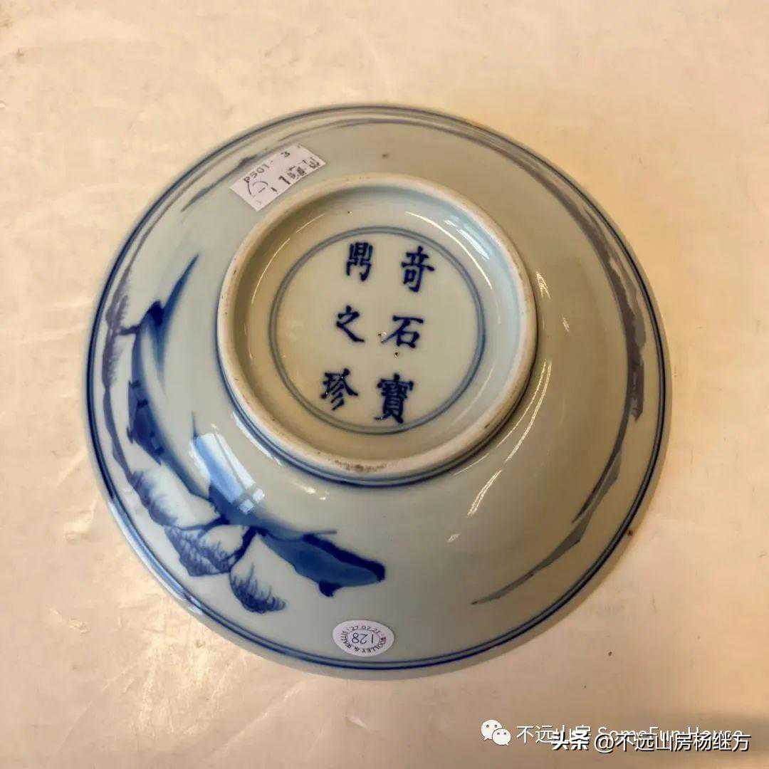 国外小拍清康熙民窑青花司马相如题桥记图案盘“奇石宝鼎之珍”款
