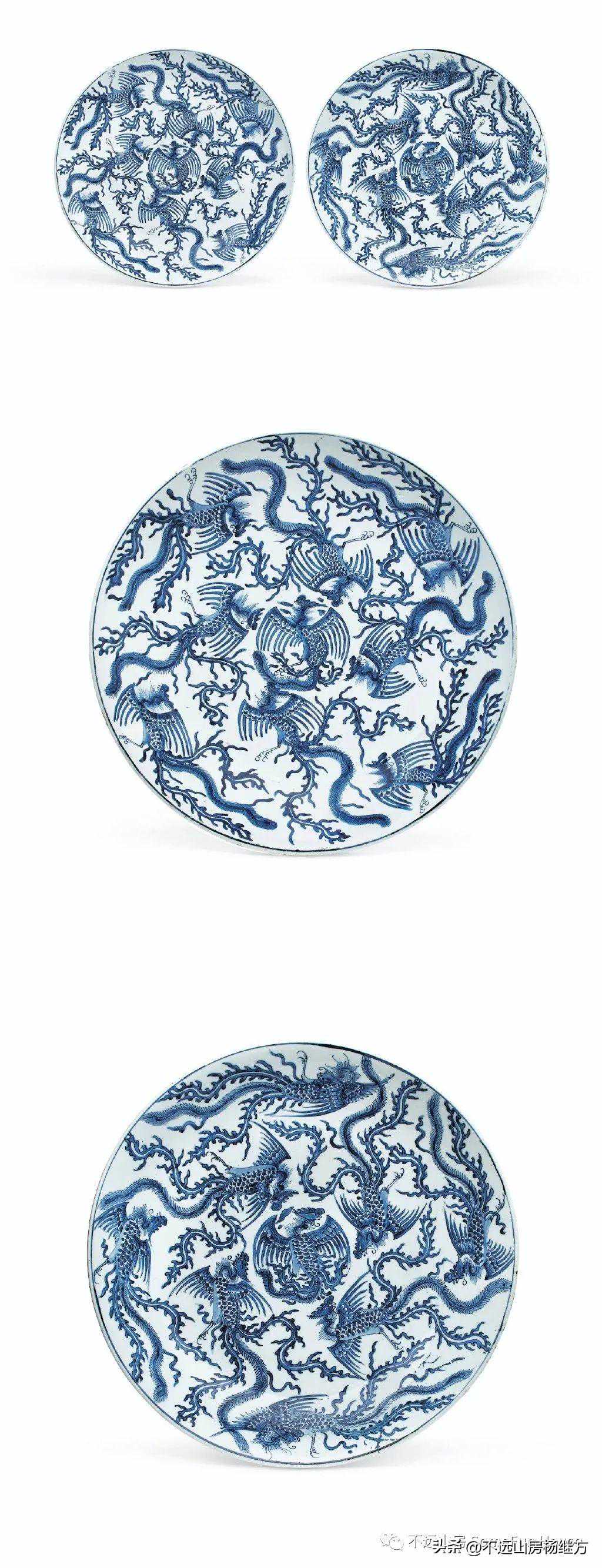 纽约佳士得2019秋的一对康熙青花九凤纹盘,文献常见明代有九龙九凤膳桌,九龙纹瓷器明清两代不罕见,但九凤纹真的难得