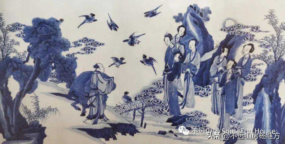 康熙青花的早、中、晚三期色调差异很大,其变化的过程基本是循着灰暗-明快-灰暗的步调发展,巅峰时期应是康熙中期。这个时期制瓷工匠已经熟练地掌握了青料的配置方法,烧制出了闻名于世的“五彩青花”,即仅用一种青料便可渲染出景物的疏密远近,阴阳向背,使画面极具立体感,达到了中国画特有的“青(墨)分五色”的效果。又由于其色泽亮丽,所以又将其称为“翠毛蓝”和“宝石蓝”。