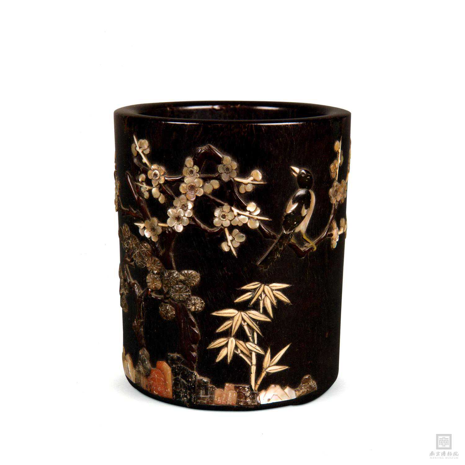 △紫檀嵌百宝花鸟图笔筒南京博物院藏