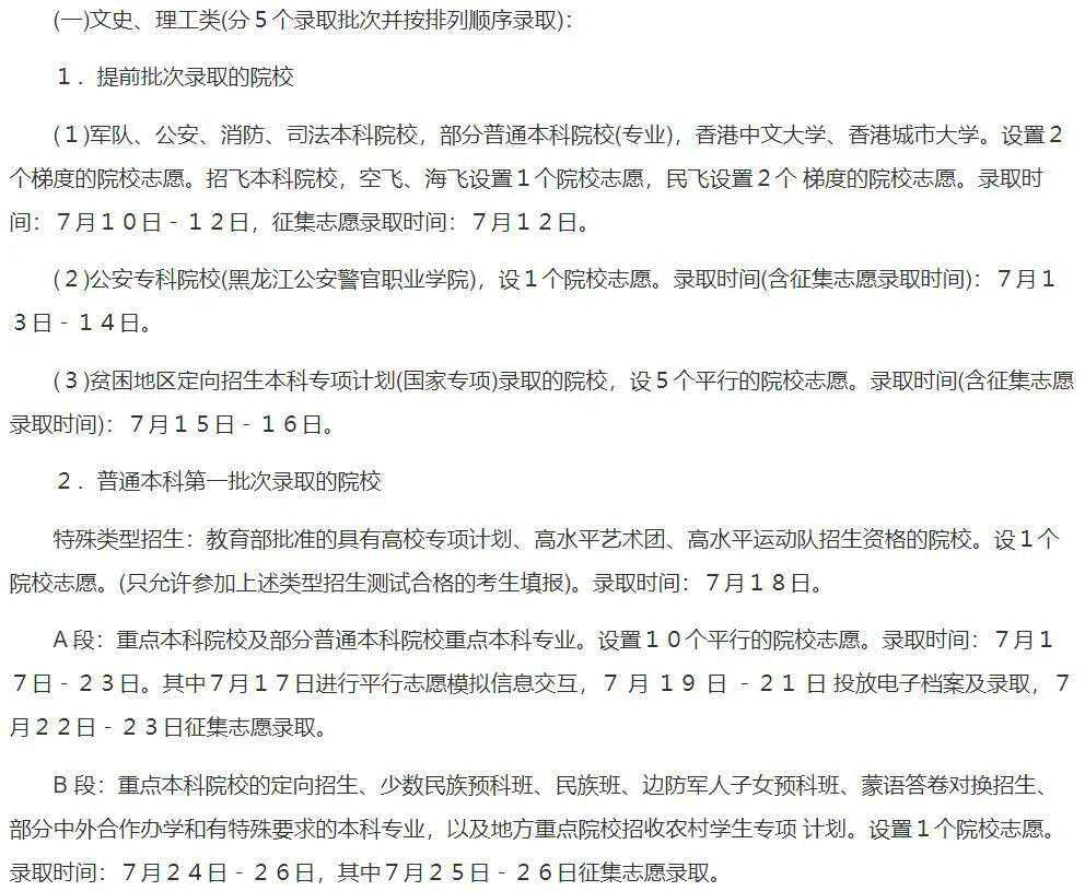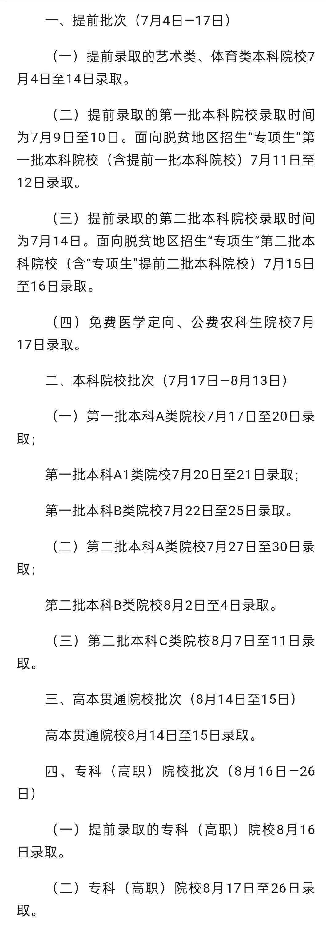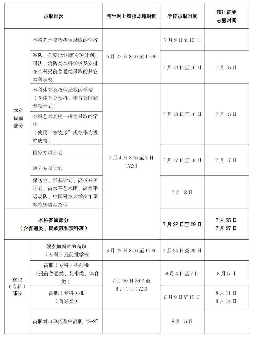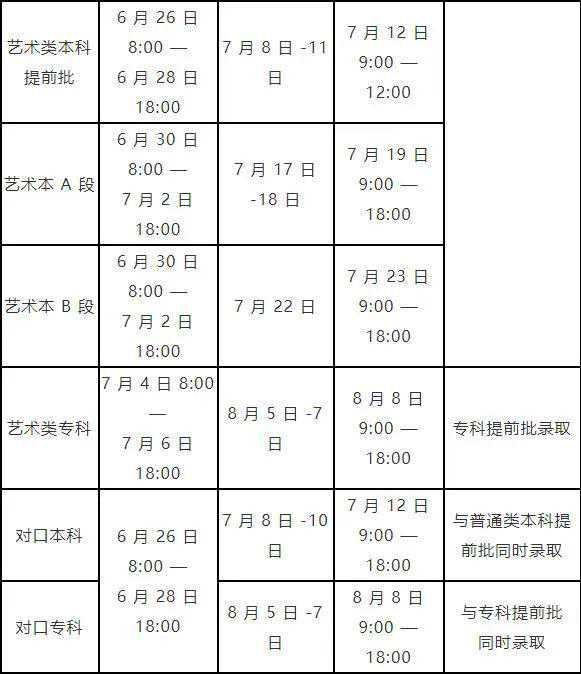 6月29日8:30—6月30日17:30符合要求考生填报提前录取院校、第一段平行录取、高校专项计划、高水平艺术团、高水平运动队和地方专项计划志愿。