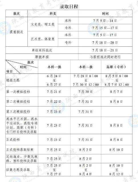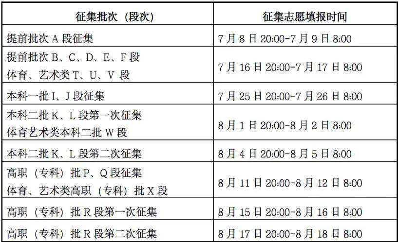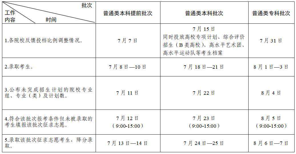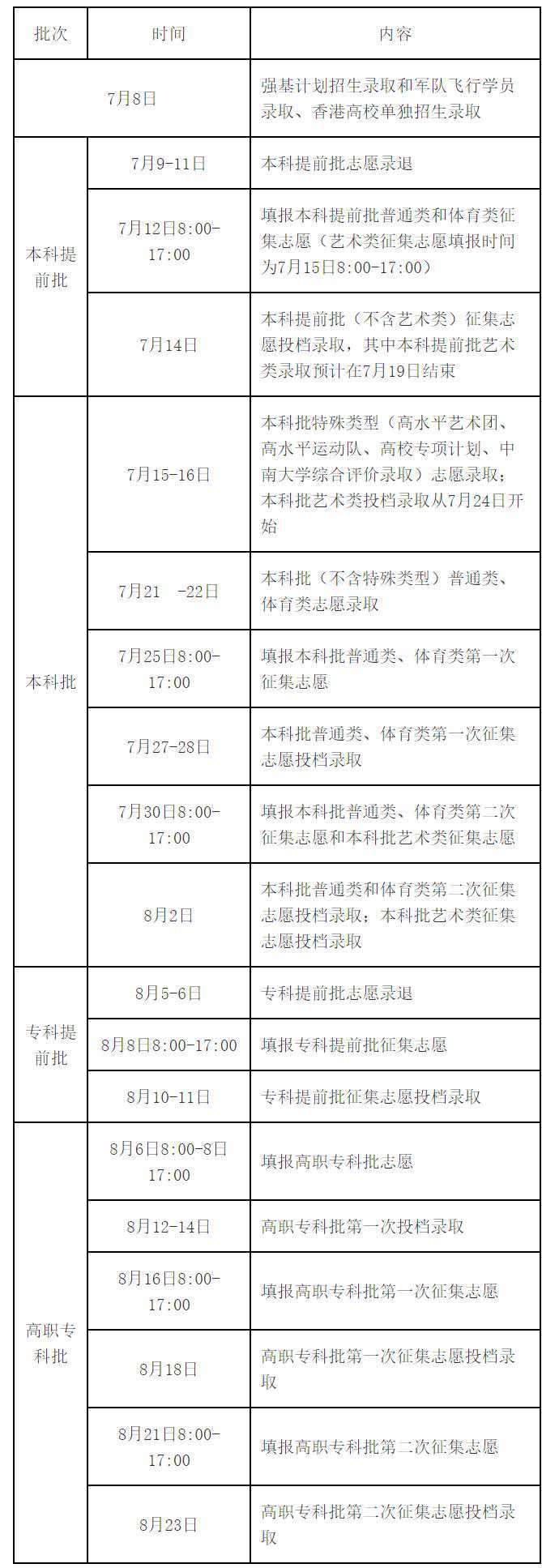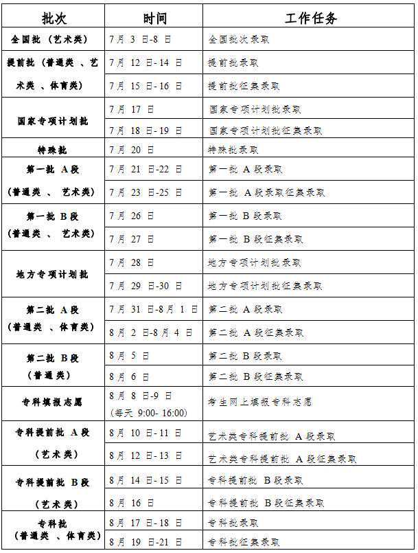 录取工作从7月10日开始,8月28日结束。录取分本科提前批次,国家及地方专项、南疆单列、对口援疆计划本科一批次,高校专项计划批次,本科一批次,国家及地方专项、南疆单列、对口援疆计划本科二批次,本科二批次,高职(专科)提前批次,高职(专科)批次共8个批次进行。