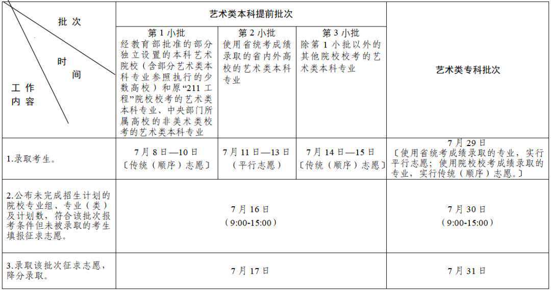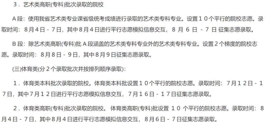 专科艺体类批次和专科提前批次录取