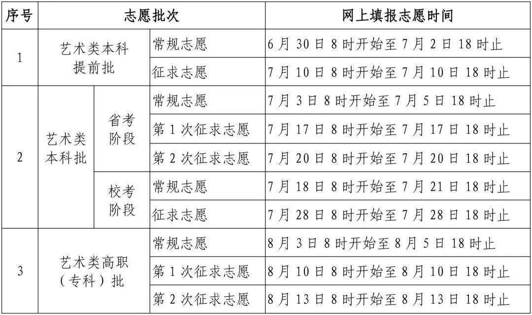 6月29日8:30—6月30日17:30符合要求考生填报艺术类第一批及三位一体招生院校、第二批第一段平行投档志愿。