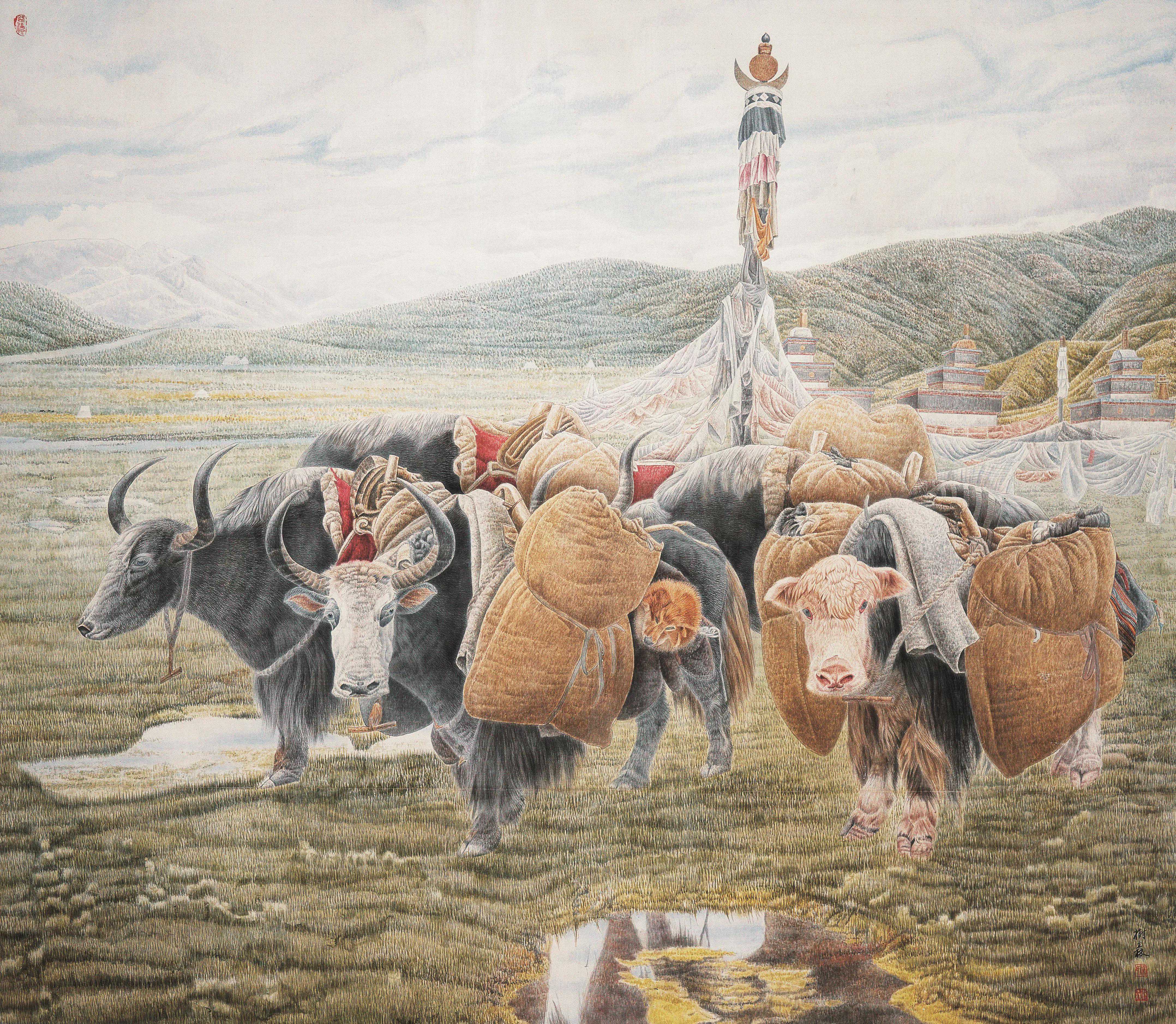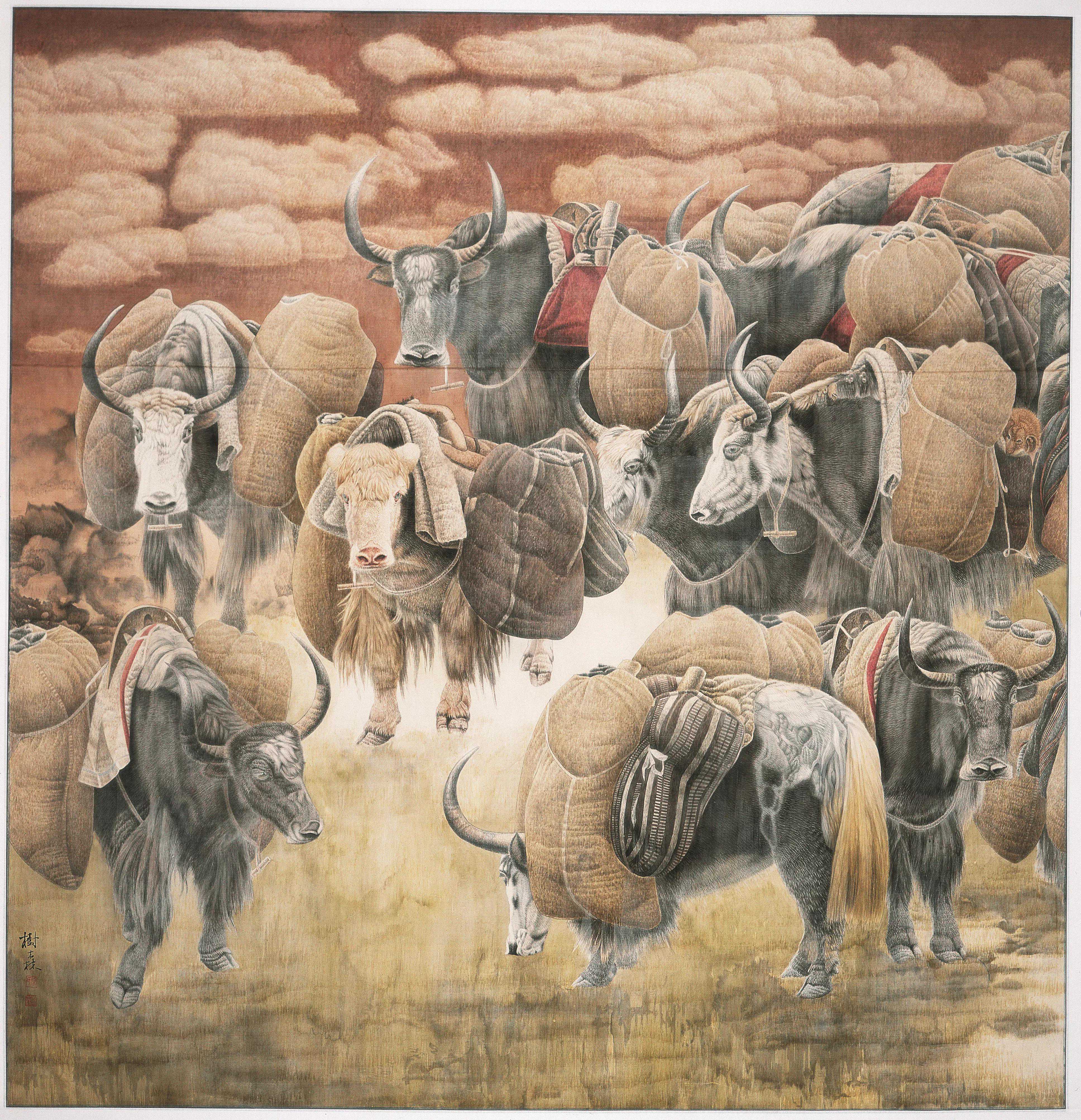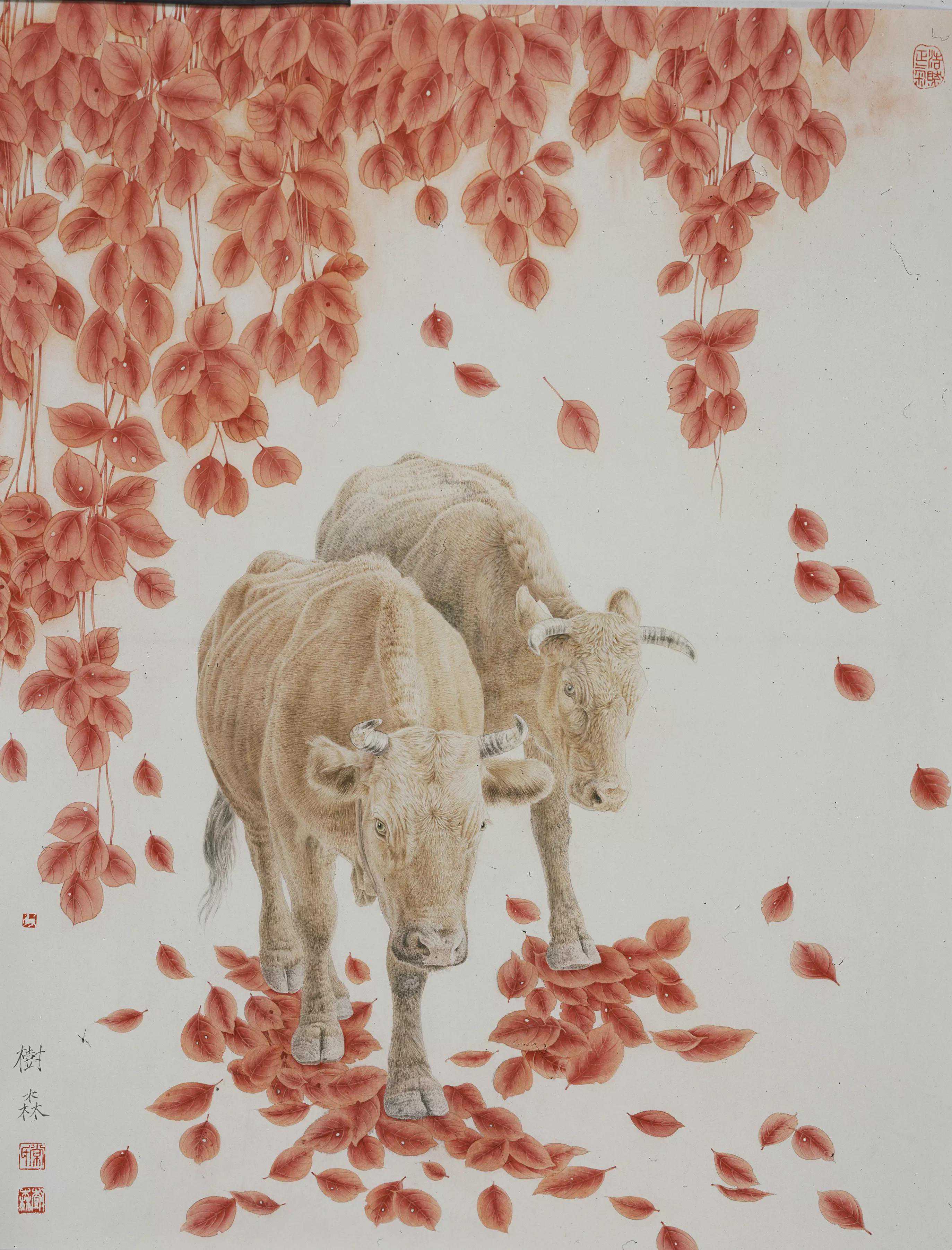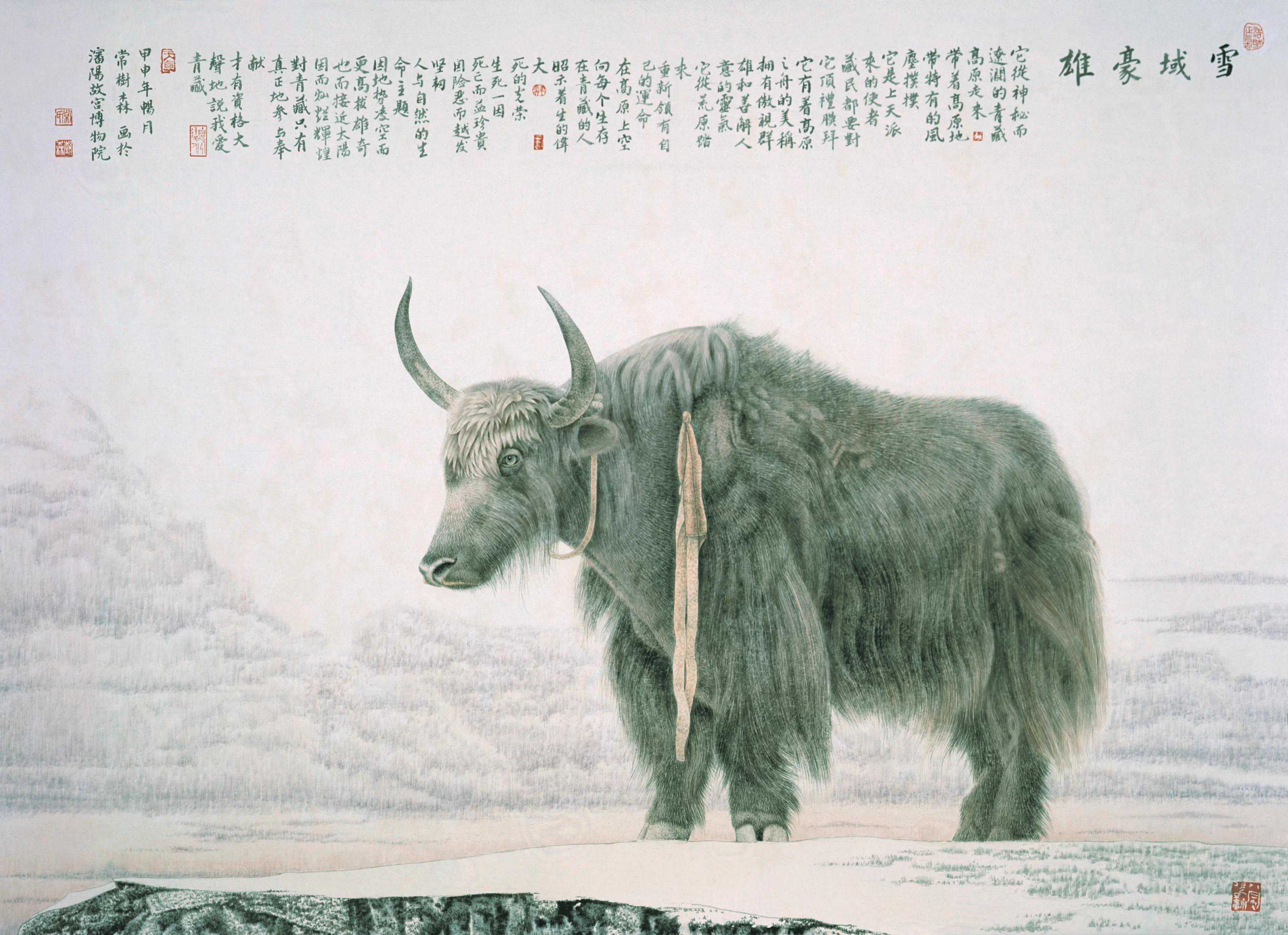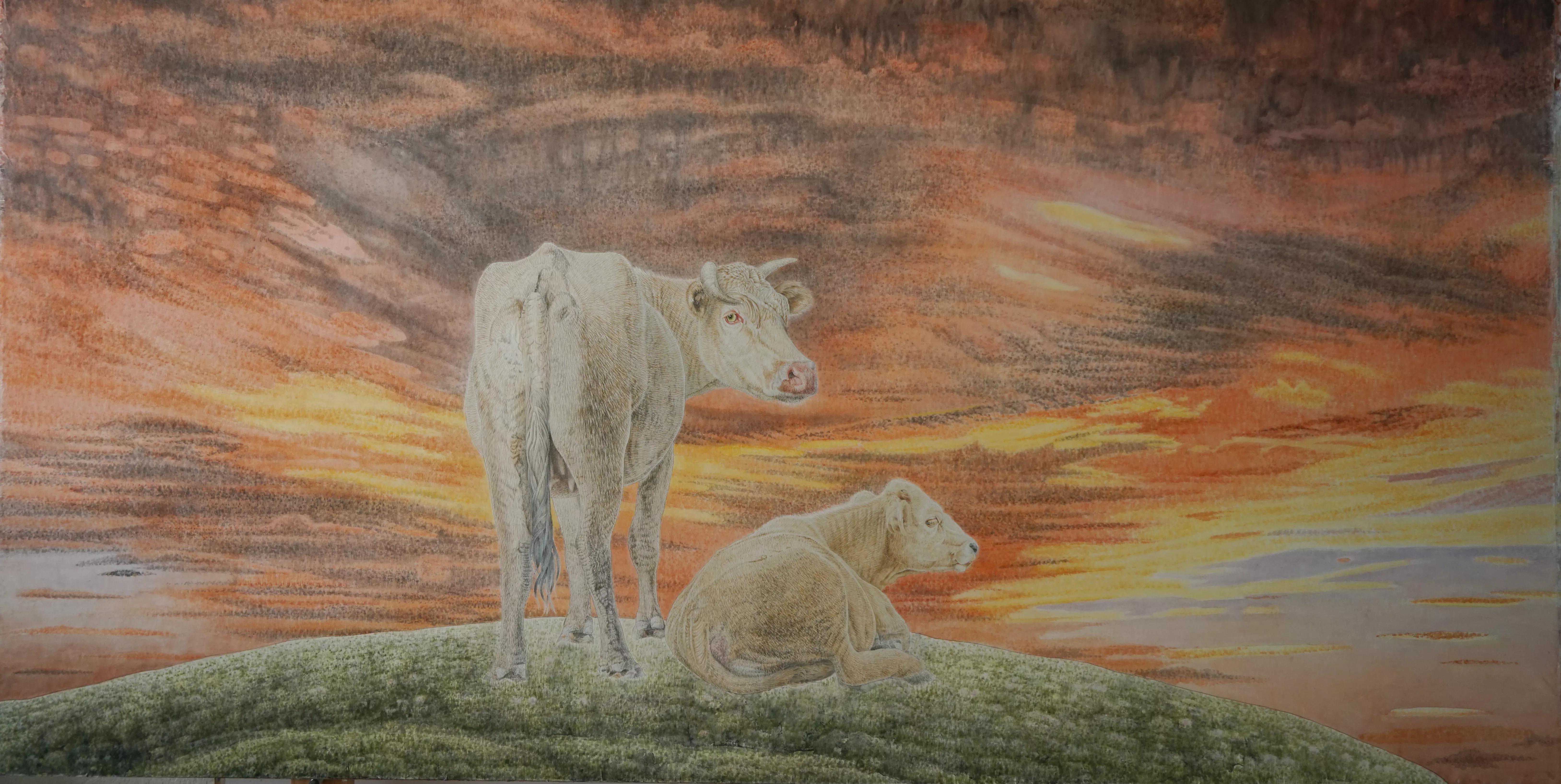 绕了这么一个圈,只是想说明,常老师绘画中的牛的神韵,是非常高妙的。作为大幅的中国工笔画,作品本身就是时间,热情,技艺与专注的集合体之杰作,画幅中众多的牛的同与异,无数细节,整体布局,色彩的烘托,真的具备了大巧之境。大多数人,均可以从这样工笔细致与宏大述事之中,享受到美感。但最难的是其蕴涵的神韵,既具大巧之飘逸细腻,又合若拙式旷达厚重!格局神韵极高。常老师的画,让人心驰神往,于我而言,好像悠然间重返非洲大草原,旁观动物大迁涉,又似置身于南极最后的极地净土,在无数企鹅间穿行。山水之间,自然之地,动物万类,感受大爱无疆。