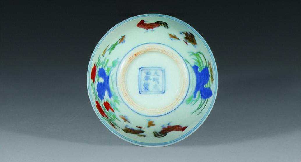 斗彩是釉下青花和釉上彩色相结合的一种彩瓷工艺,宣德时期创制的青花红彩广义上也可称之斗彩,并为斗彩的高峰期成化斗彩瓷器作了铺垫。有名的成化斗彩鸡缸杯,形制小巧玲珑,多数画公鸡一、母鸡一、小鸡三,并有牡丹湖石和兰草湖石。湖石以青花表现,以各种彩色组成鲜丽、幽雅的画面。