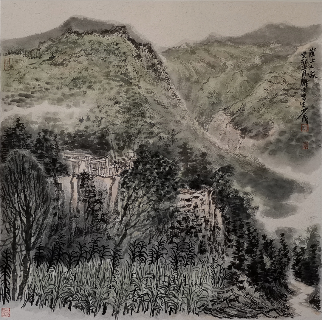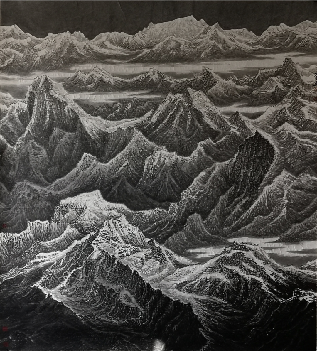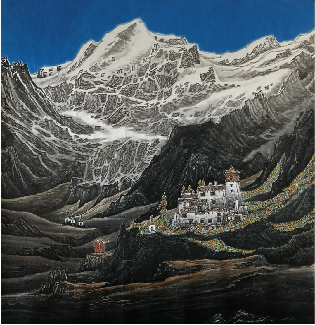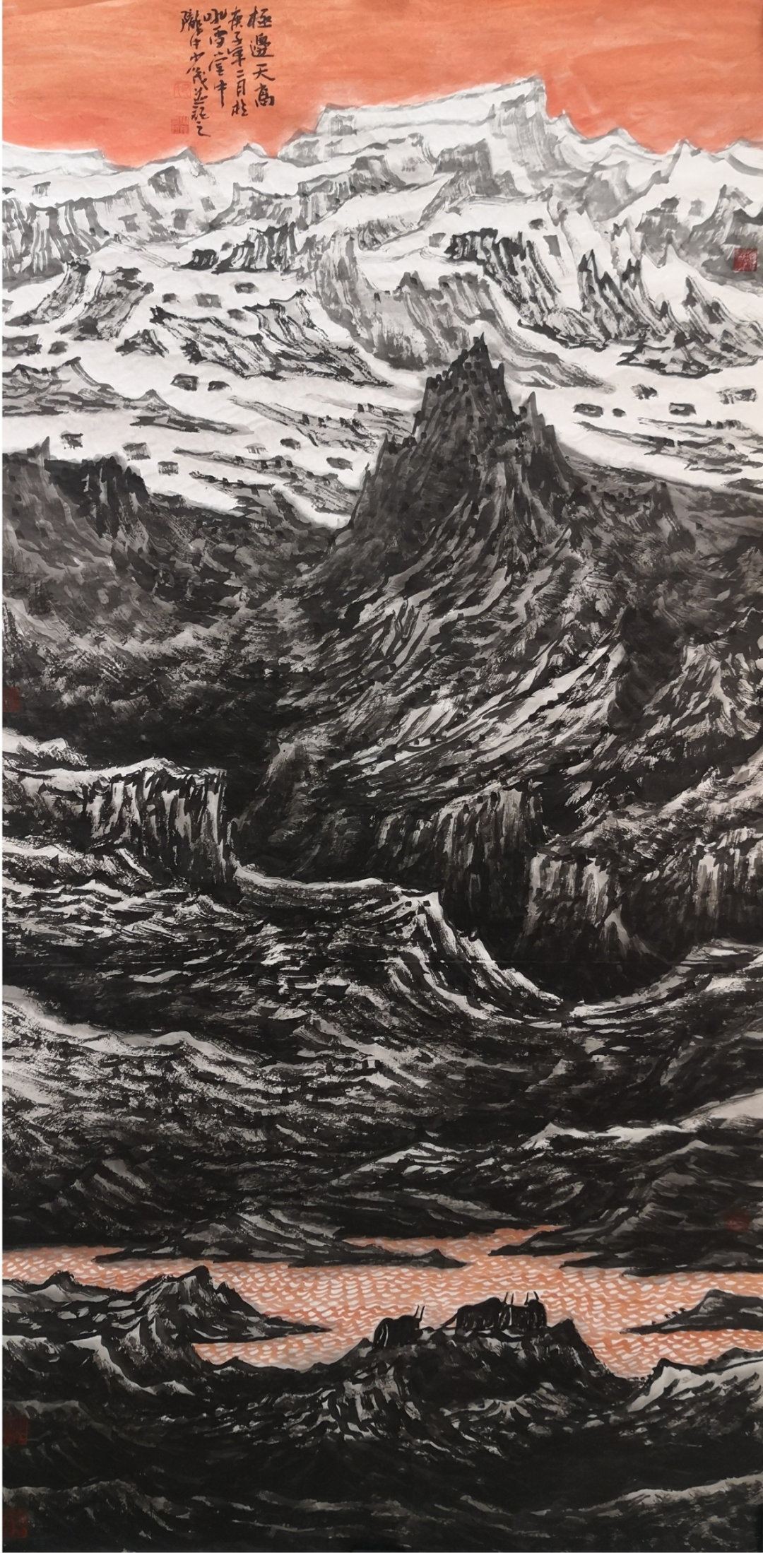 一般而言,观念的不同,导致笔法与山水结体之间产生变异。但包少茂的山水实践,并非观念先行,他一开始就摆脱了前辈画家背负的以历史为主体的人文精神,从笔墨语言的尝试和探索中,提炼出符合自己生命底色的山水信仰:包少茂从小生活在著名的当归之乡——岷县的大山深处,在那里,岷山尽管驰名天下,高不可攀,却长期笼罩在贫寒之中,一种巨大的力量在这种反差中产生。当他走出大山之后,这种感受和经验就更加突出了,“岷山”成就了他最初的绘画,又矗立在记忆和视觉的尽头,成为永远的指引——至大至刚,崇高而又圣洁。由此出发,构成了包少茂西部山水画的精神谱系。